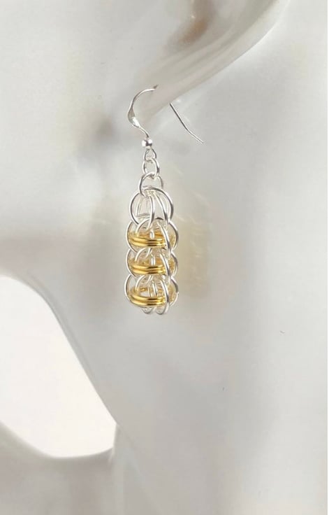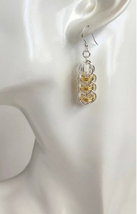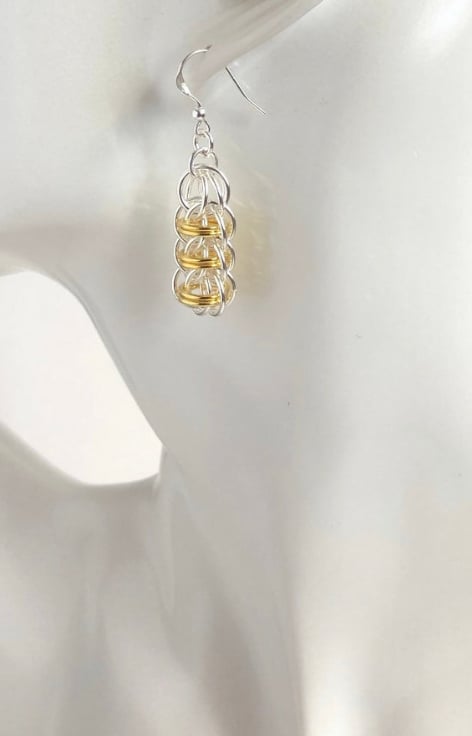 Two tone Sterling Silver earrings have been made by using individual Sterling Silver rings, 6 of which have been plated with gold, to create this beautiful Chainmaille weave.