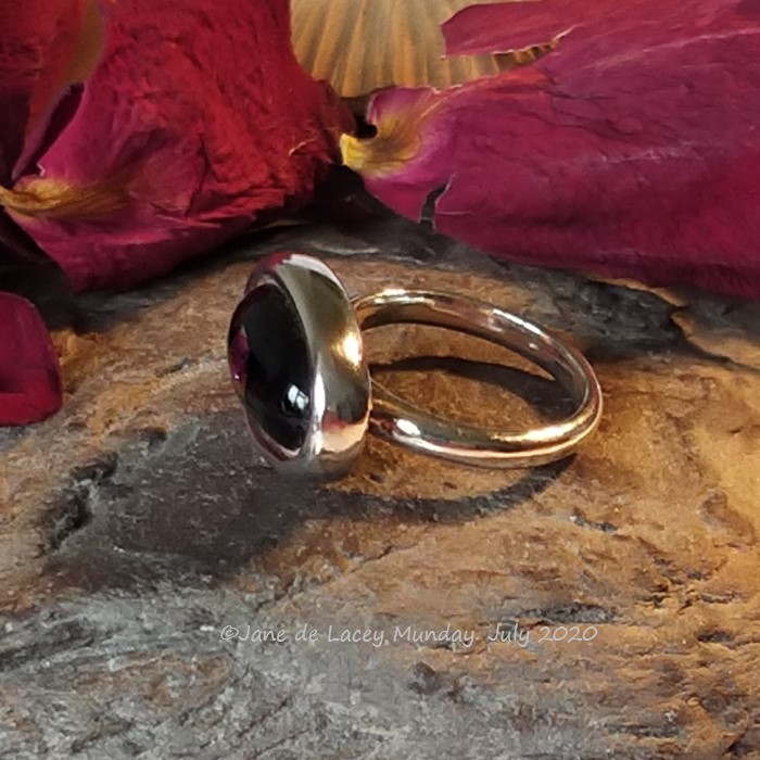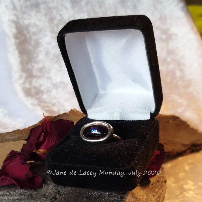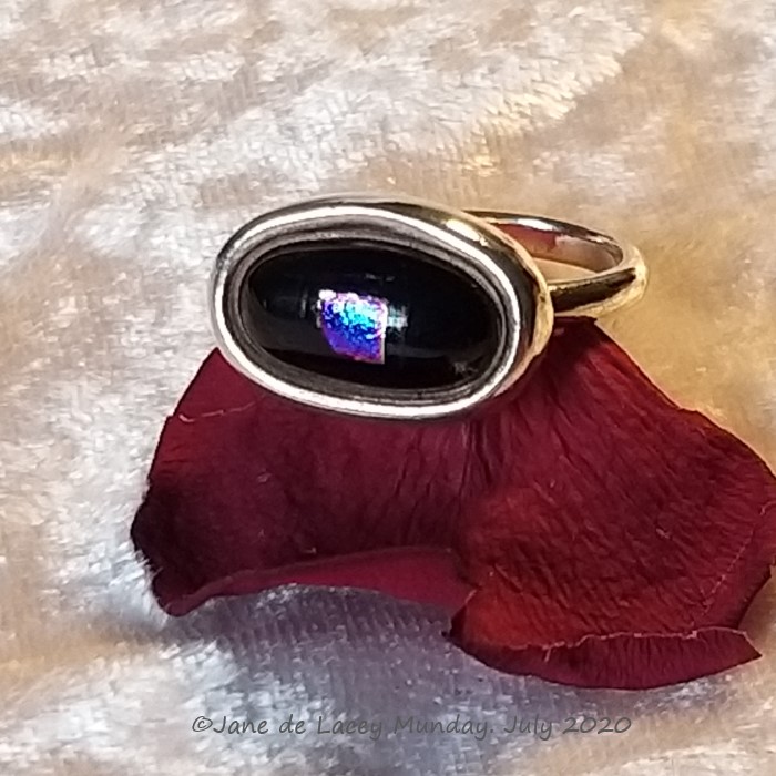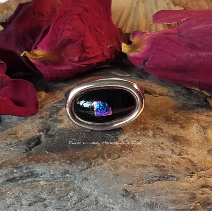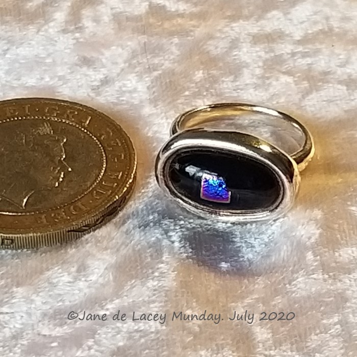 I had two pieces of dichroic glass of similar shape and size, though slightly different. I didn't think they were suitable for a pendant setting and so put them into ring settings, one horizontal, this one, and the other in a vertical setting. The vertical one has already been sold, so just this one to find its perfect wearer for.