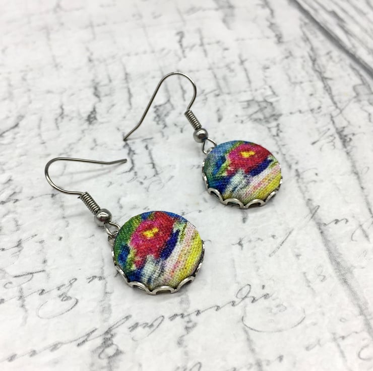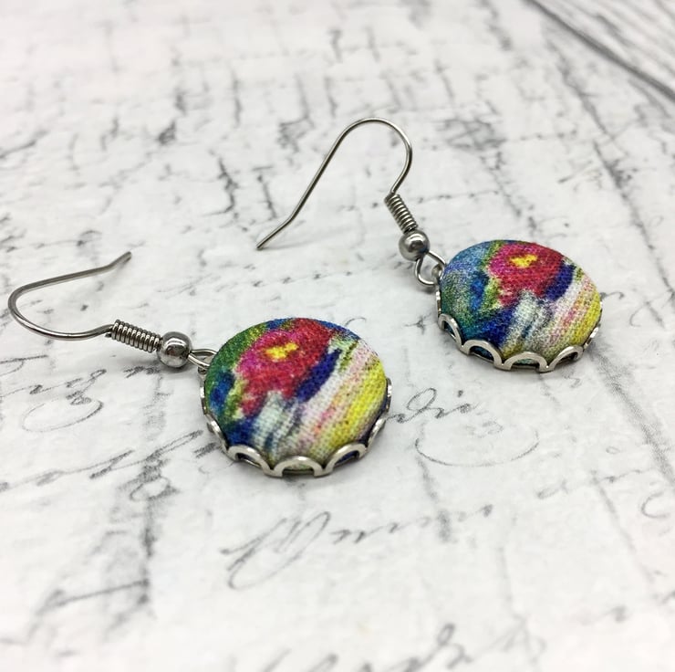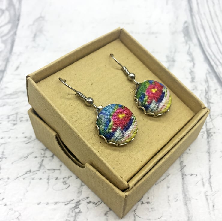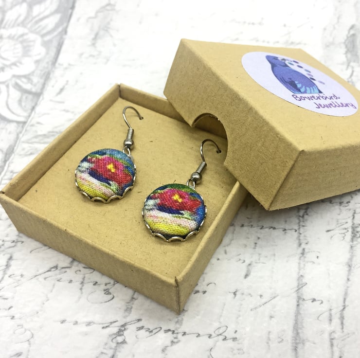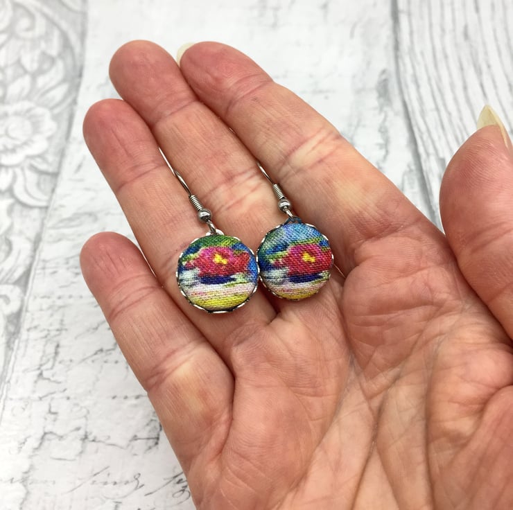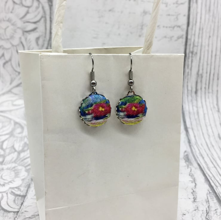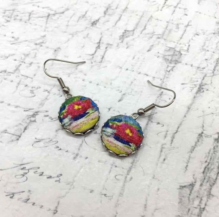These unusual dangle earrings are made from 100% cotton fabric that has been digitally printed with a print of Claude Monet's Water Lilies, beautiful blues of sparkling water from the pond and lovely splashes of pinks and reds for water lily flowers through to pale greens and whites for lily pads.