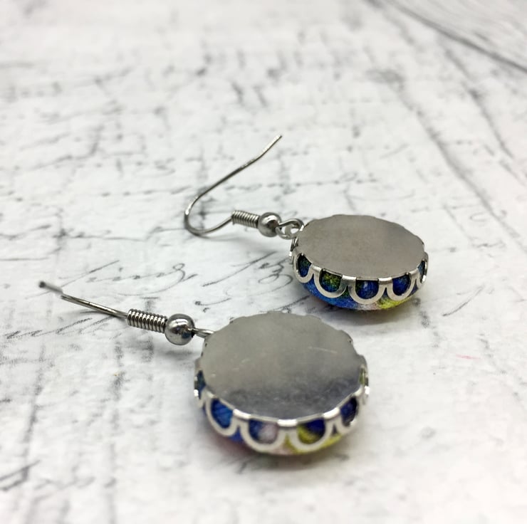 I selected a section featuring blue shimmering water, and red and pink water lily flowers, then created two small fabric covered flat backed button, in which I have tried to keep the pair as matching as possible. I then secured the buttons into antique silver or stainless steel plated (high quality brass base metal) scalloped edged round settings, using high quality professional jeweller's glue. I've then added hypoallergenic surgical steel earring hooks, that are perfect for anyone with extra sensitive skin.