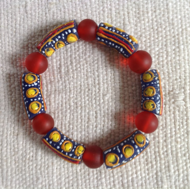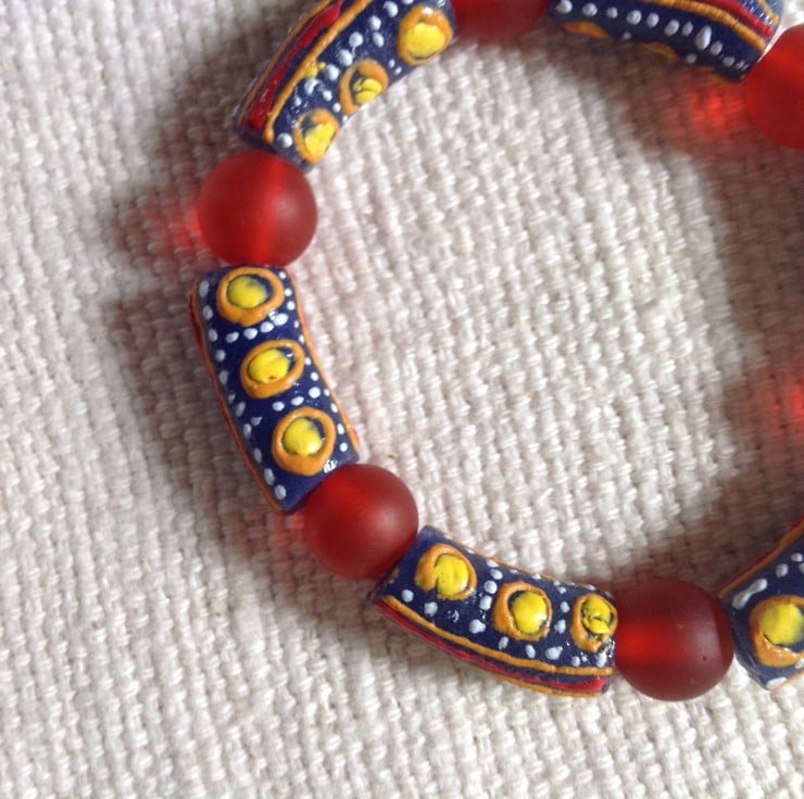 Multicoloured handmade glass beads from Ghana, made in African village workshops from recycled glass and then strung here in Shropshire. Large red rounds sit between the tube beads..