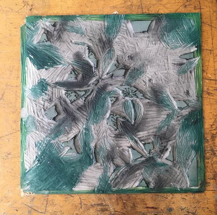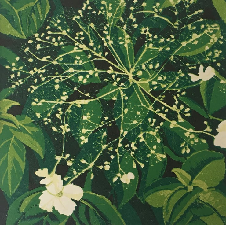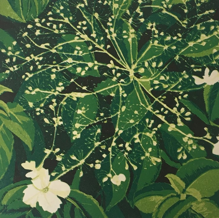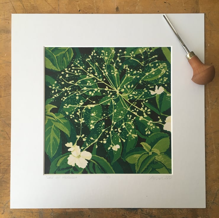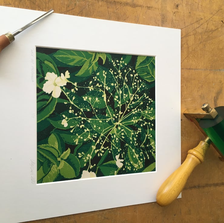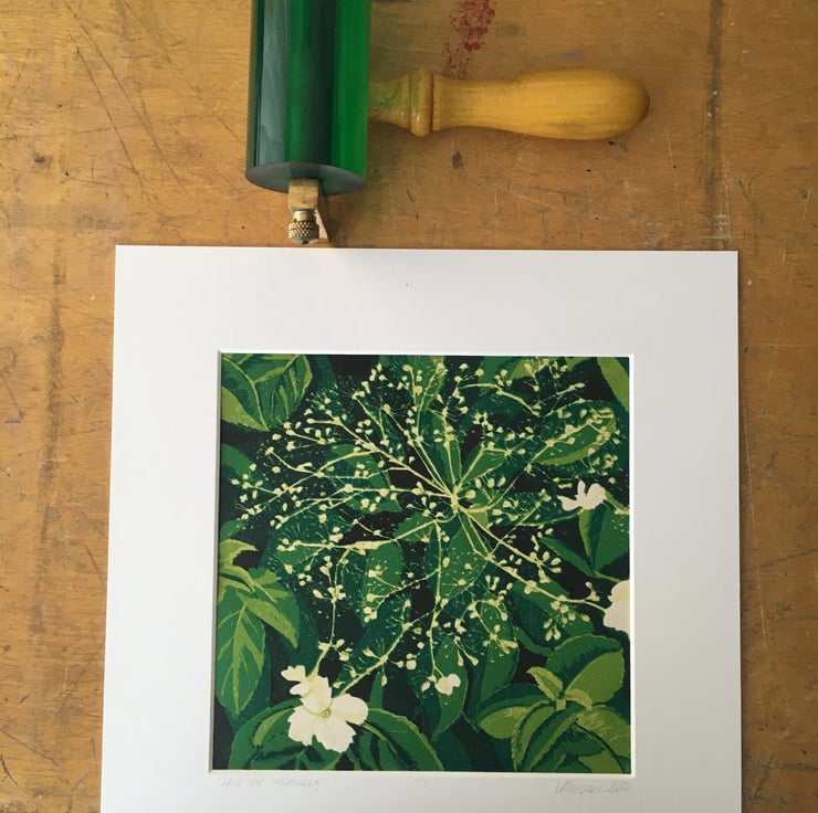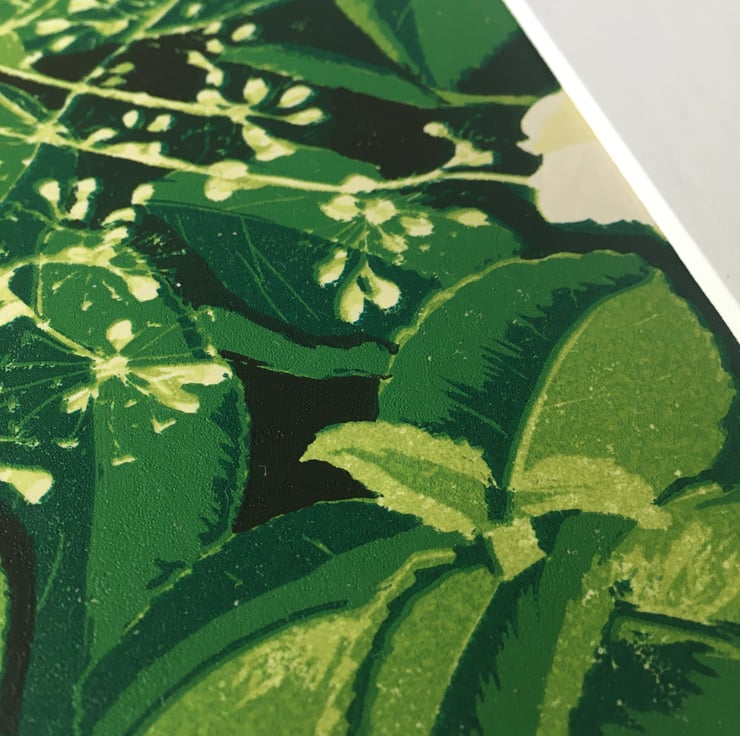 The range of greens lent themselves beautifully to the reduction printing process, building up the layers one by one.