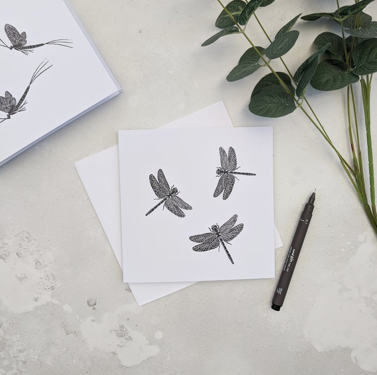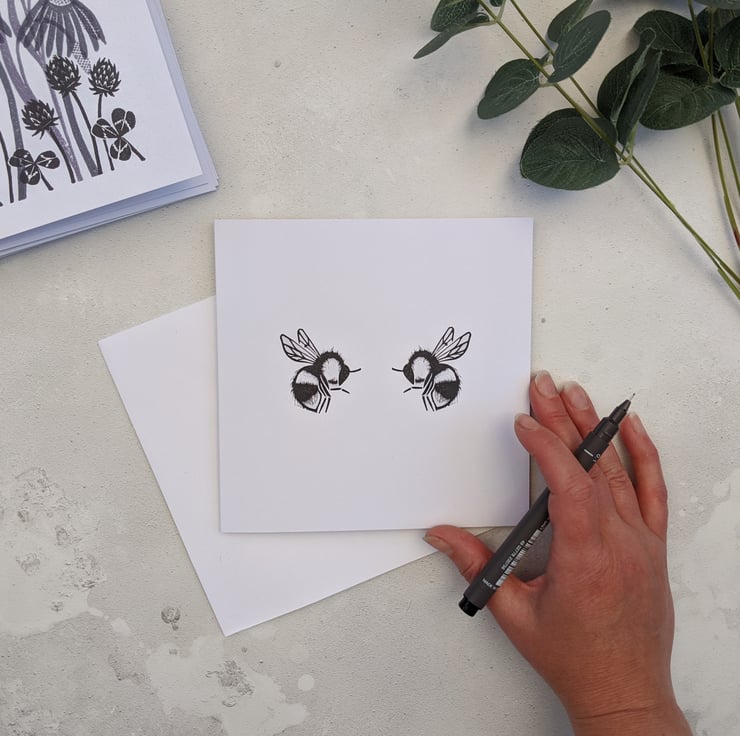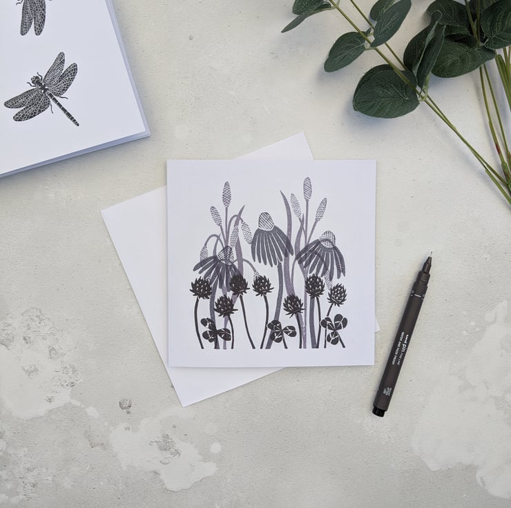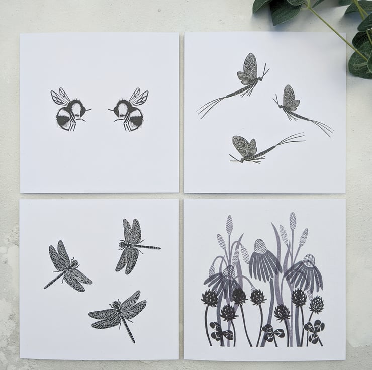 Flying insect and meadow flower note cards, professionally printed in the UK from my original linocut on 300gsm card.