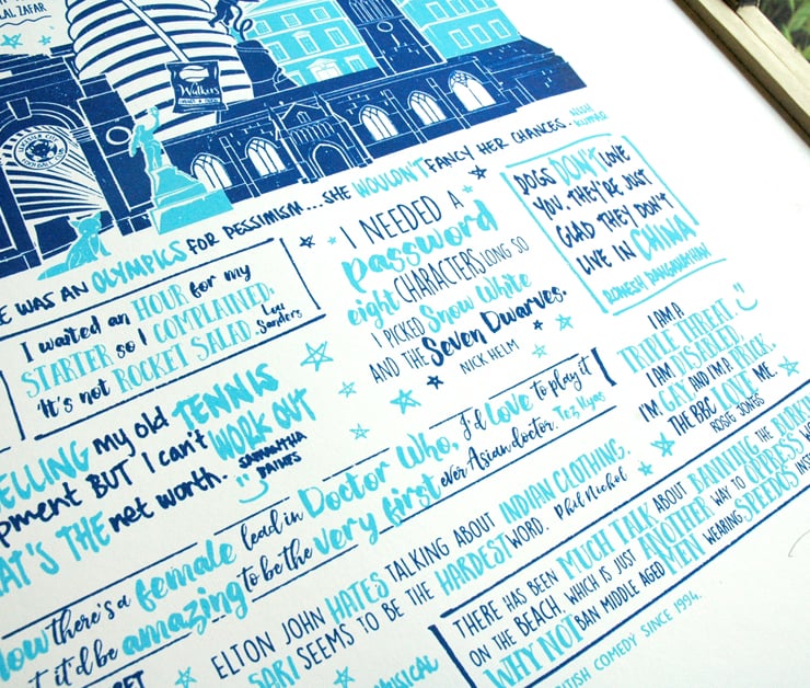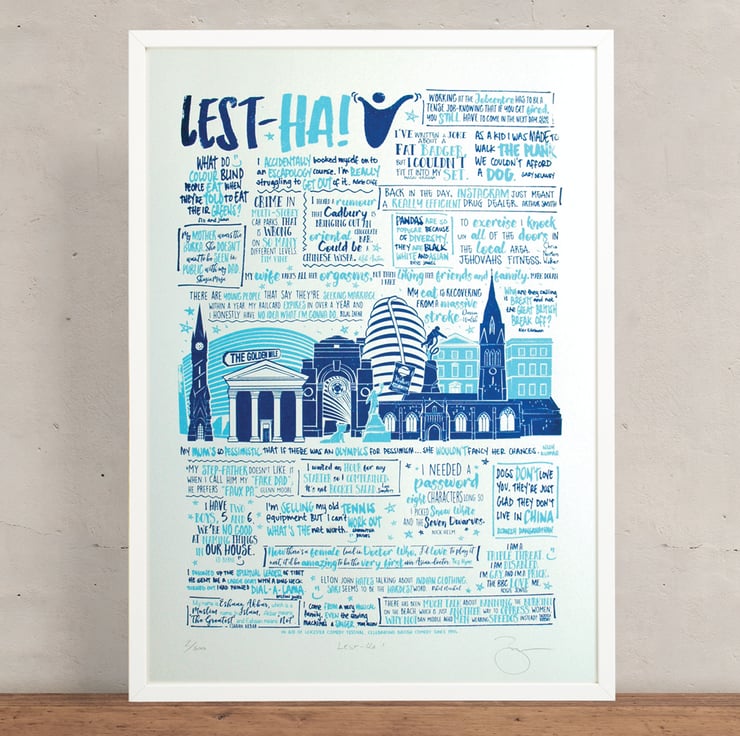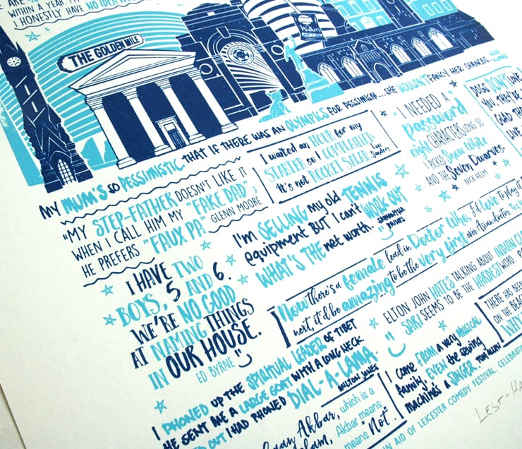 This screen print (titled ‘Lest-Ha!’) was done in partnership with the Leicester Comedy Festival. It features jokes from comedians who regularly perform at the annual Leicester Comedy Festival. The festival is the longest running comedy festival in Europe, having been produced every February since 1994.