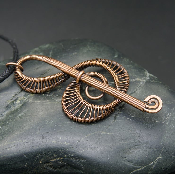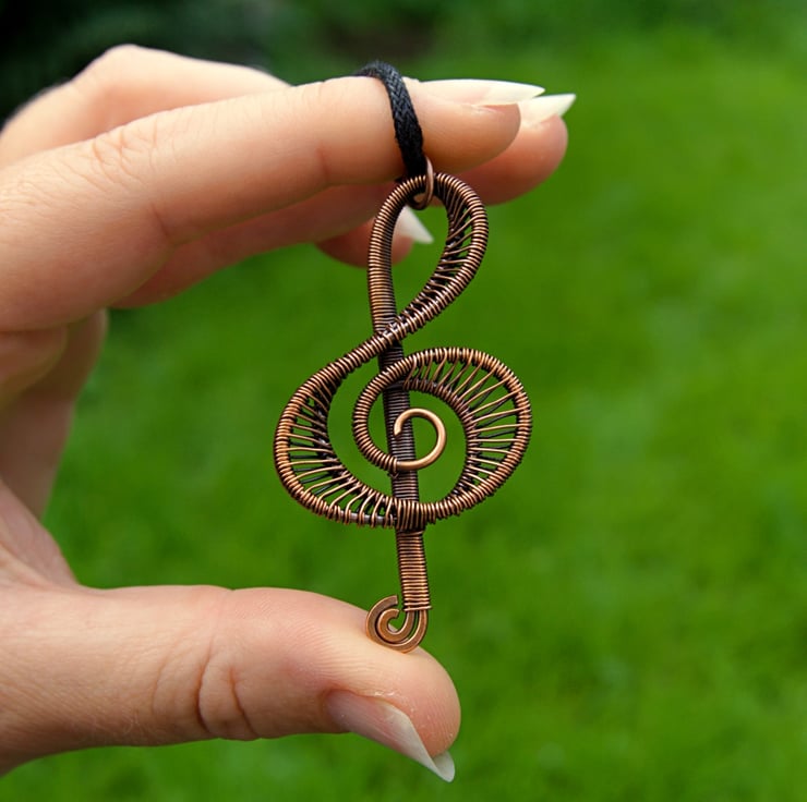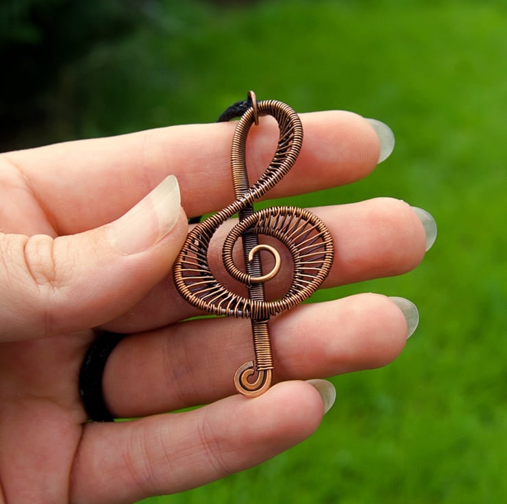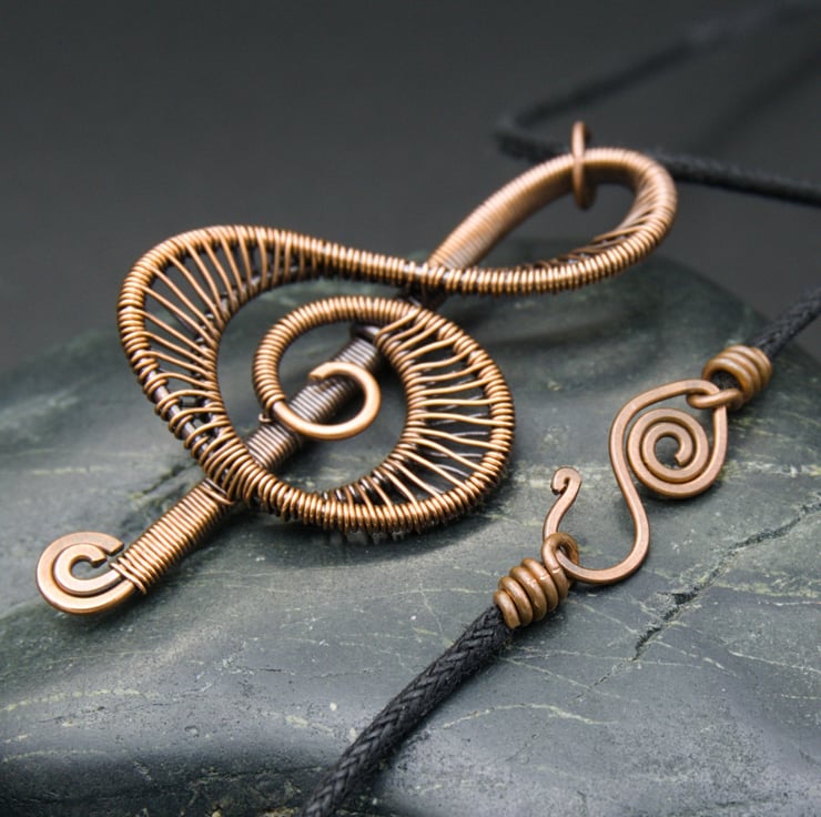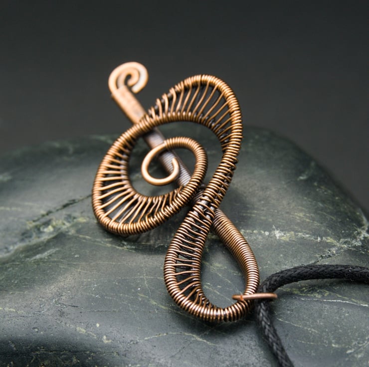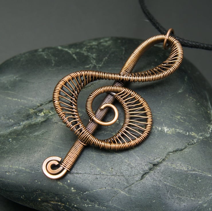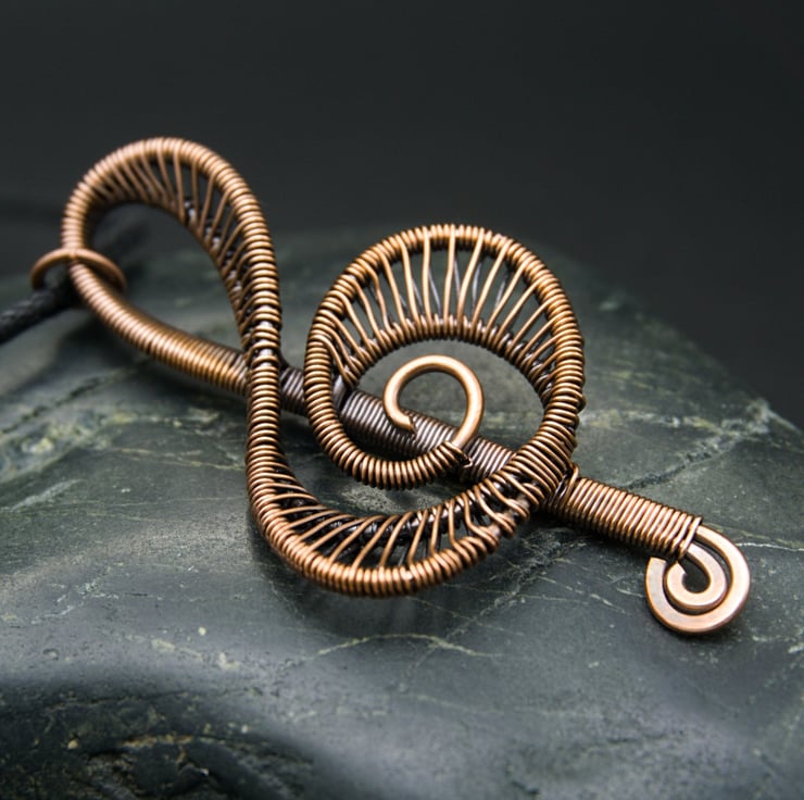 This stunning treble clef pendant has been completely hand woven from copper wire, & would make the perfect gift for the music lover in your life. I've used two thicker lengths of wire as the frame - simply binding them together for the straight back, & then splitting them to sweep at different angles around the curves of the treble clef. The spaces created around the curves are woven together with a ladder weave giving a beautiful striped effect. I've oxidised the finished pendant to antique the copper, & polished the exposed wire to a lovely shine, really giving depth to the intricate weaving.