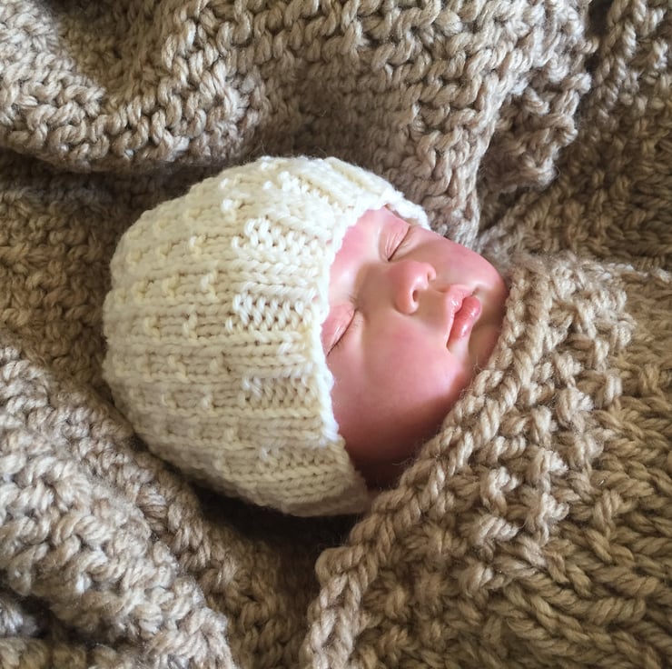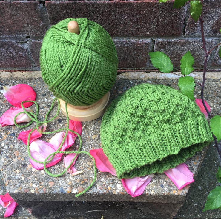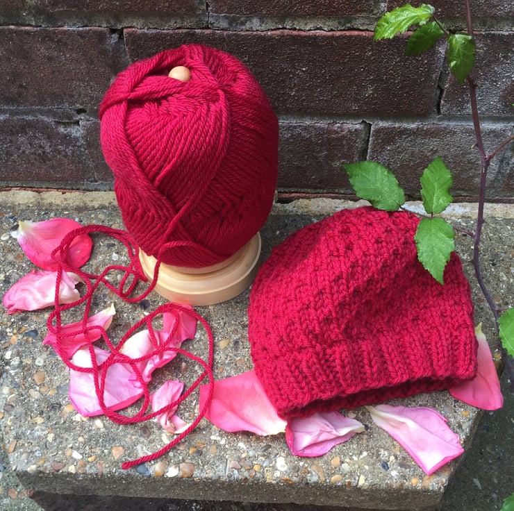 This textured beanie hat knits up quickly and is lovely and snugly. It has a ribbed brim with a dot stitch body and is knit in the round using worsted weight yarn. The dot stitch pattern is formed by repeating four rows of instructions, making it an easy, quick knit.
