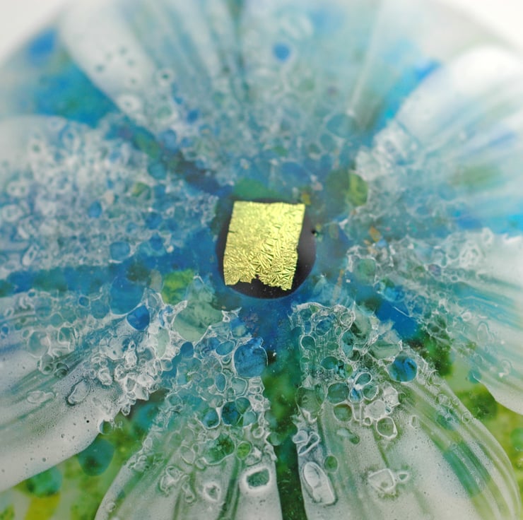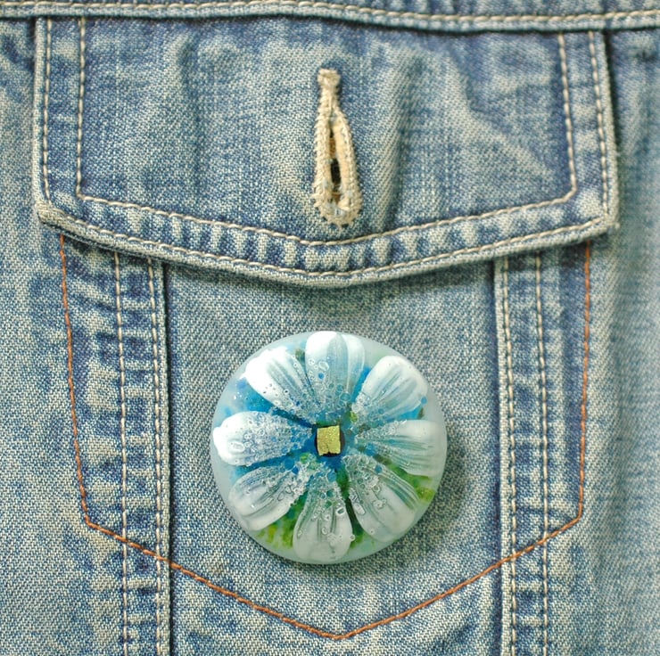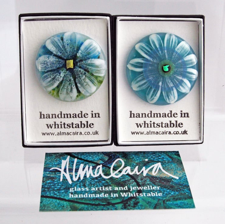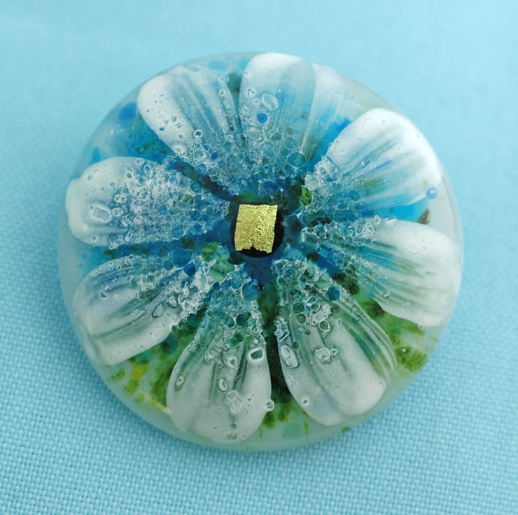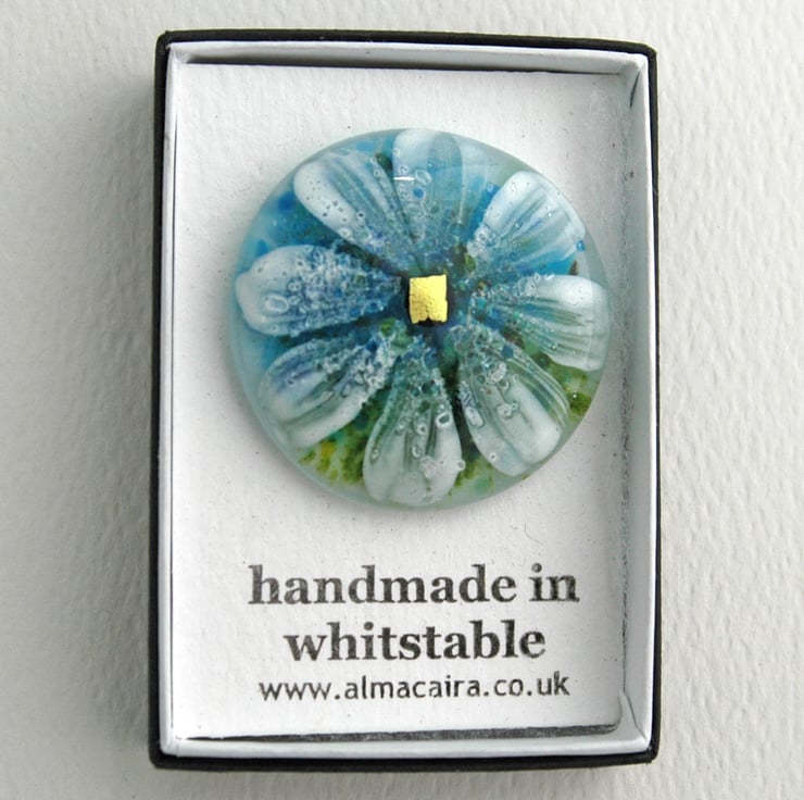Created from layered Bullseye glass in my Whitstable workshop. The white enamel painted flower has a gorgeous dichroic glass centre and sits above a beautiful, blue green background. Plated sterling silver brooch back glued with epoxy resin to create a permanent bond. Supplied in a black card gift box.