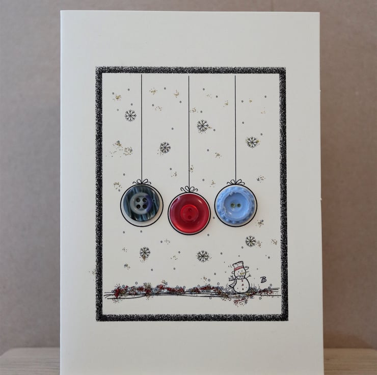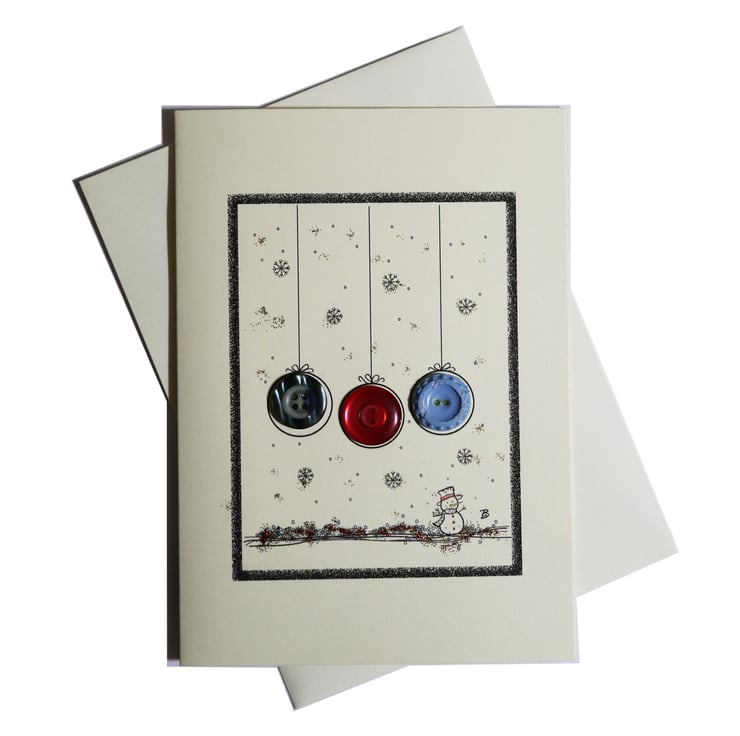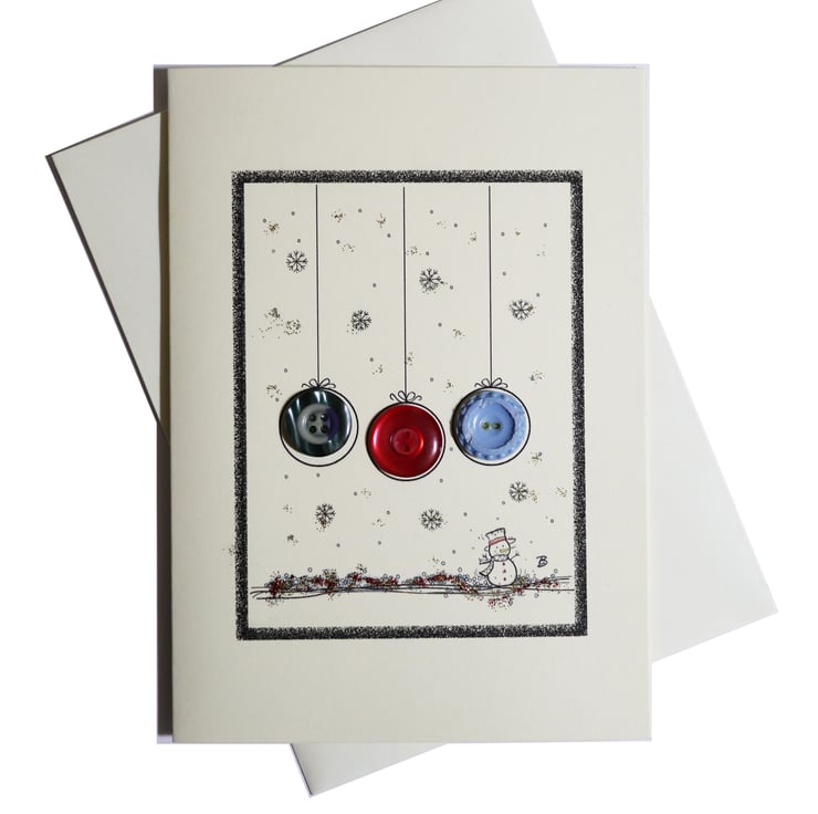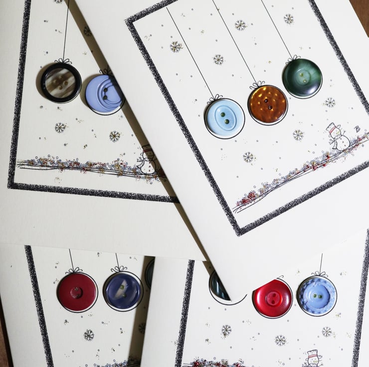 Pack of 4 - Vintage button Christmas baubles and snowman design greeting card