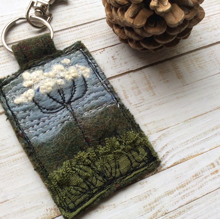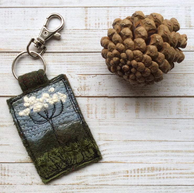 This up cycled wool keyring has cow parsley set against a blue sky and green meadows. It measures 8cm x 5cm approx. With the split ring the length is 9.5cm. With the clip the length is 13cm. The charm clip can be removed if you want it shorter.