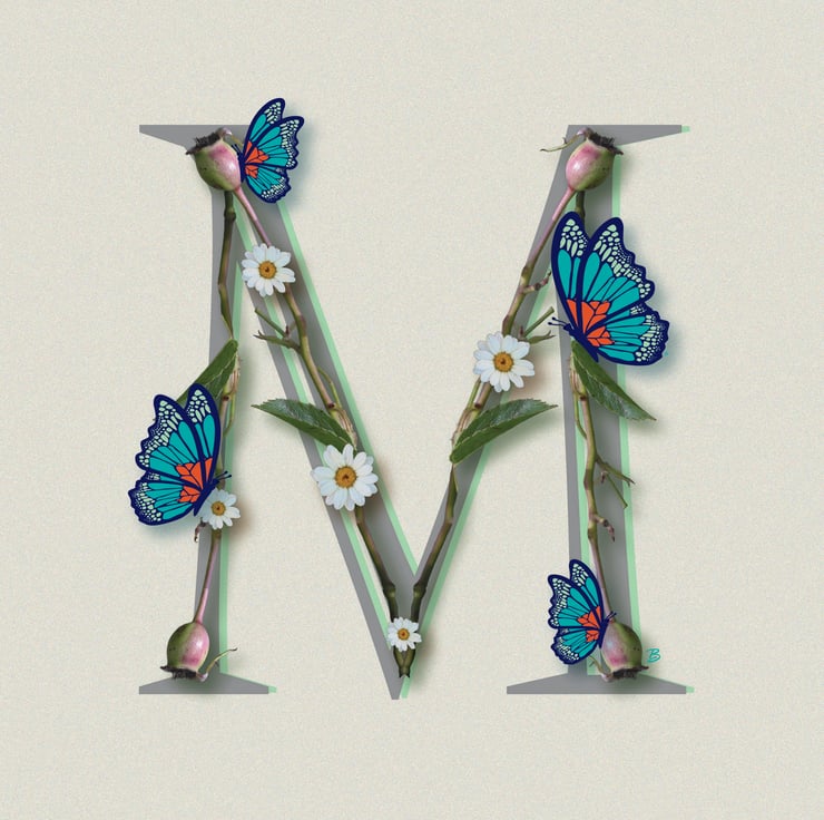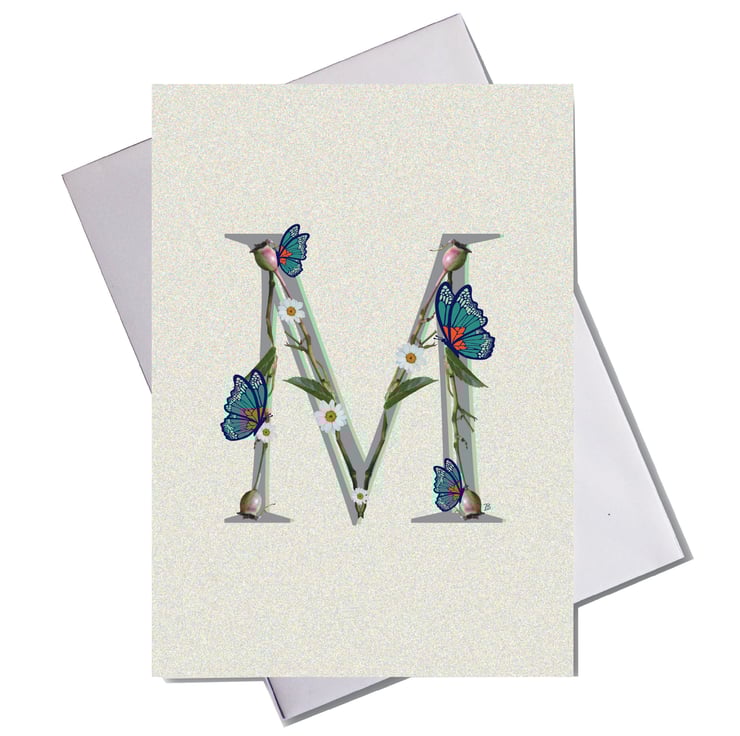 Alphabet - M - flower branch design with butterflies greeting card