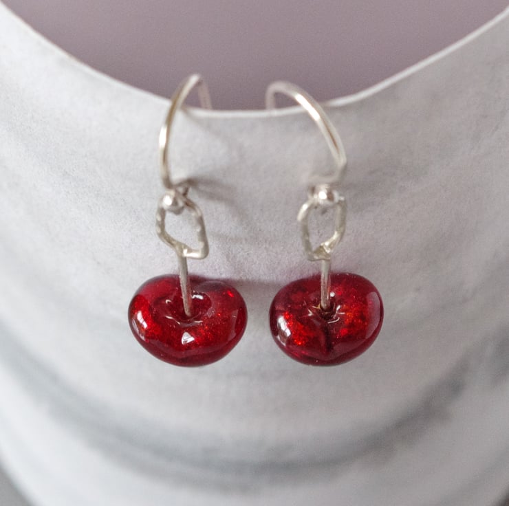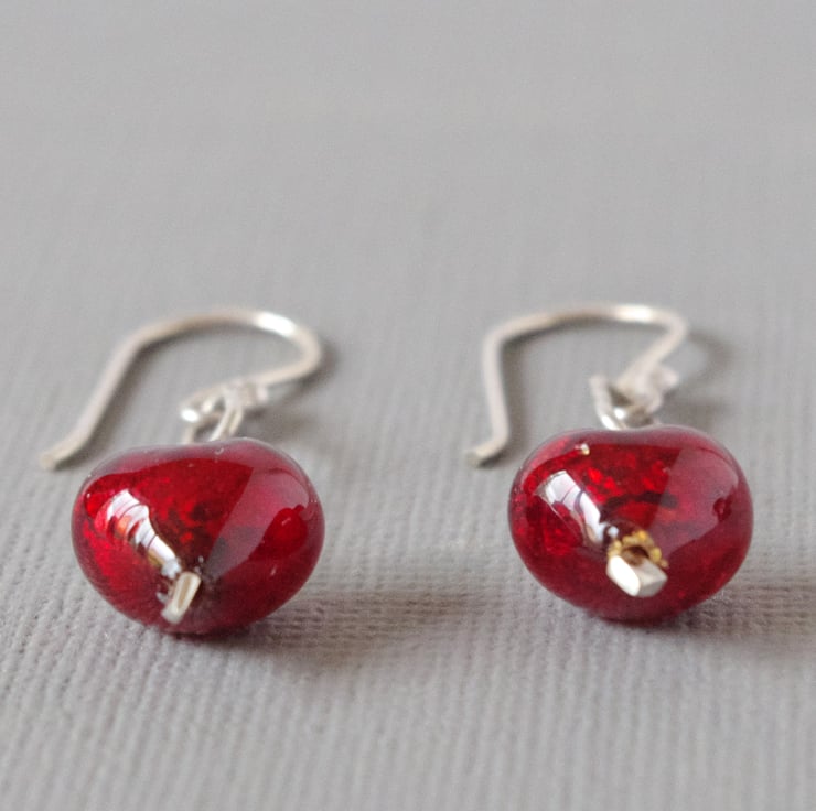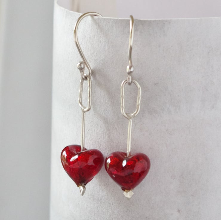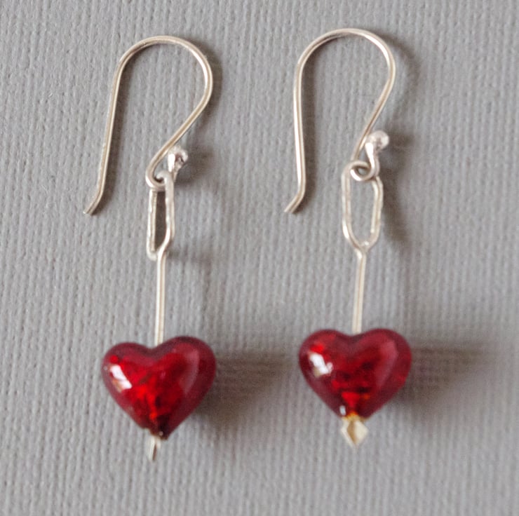 Juicy ruby red Murano Hearts lined with 24 Karat gold and pierced by a sterling silver arrow handcrafted at my West Sussex workshop. This is a unique design to Mermaid's Purse jewellery, using genuine Murano hearts from the Murano factory in Venice, and features my handmade 925 sterling silver ear fixings, because to use mass produced fixings for such beautiful handmade Venetian glass beads would be a travesty! In order to create the arrow I used forging and hammering techniques, polishing and imprinting the lines of the "feathers" onto the loop from which the earring hangs. The whole earring, including ear fixings measures 35 mm long and features a 10 mm 24 Karat gold lined heart. The gold lining can just be seen in some of the close up photographs. As such, these earrings are delicate, lightweight and comfortable enough to wear all day. The second to last photograph shows the earrings next to a vintage lipstick case, to give a sense of scale.