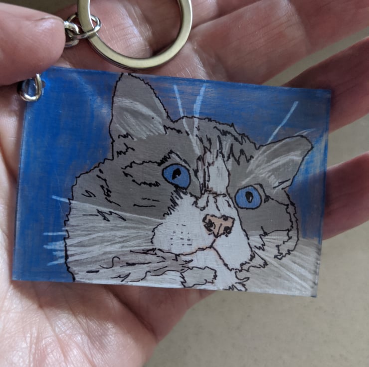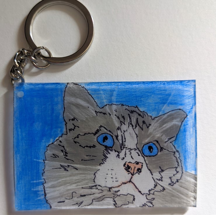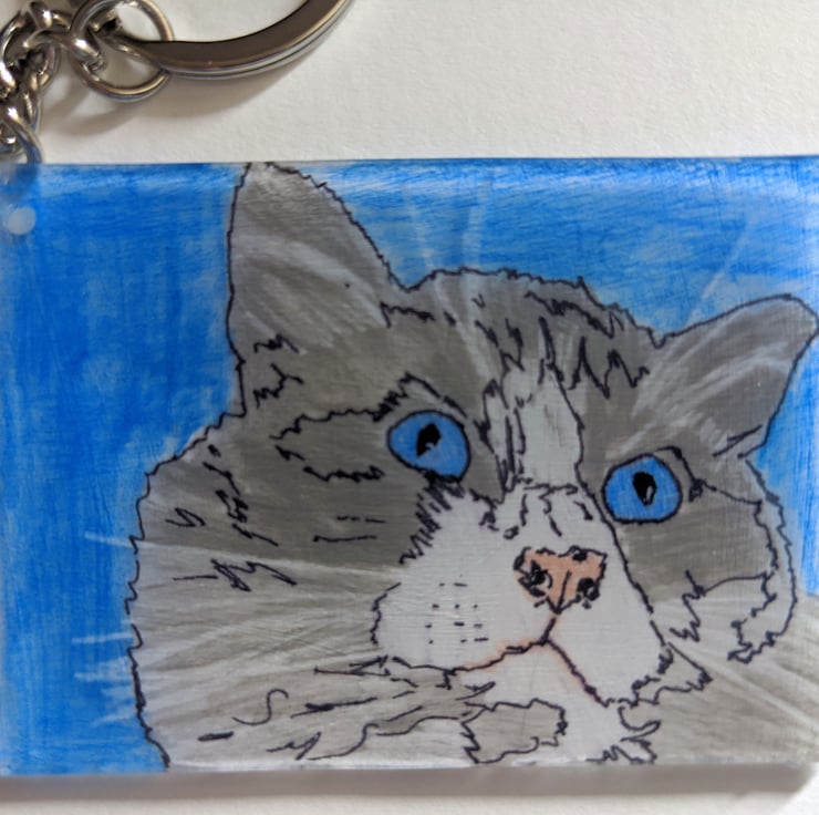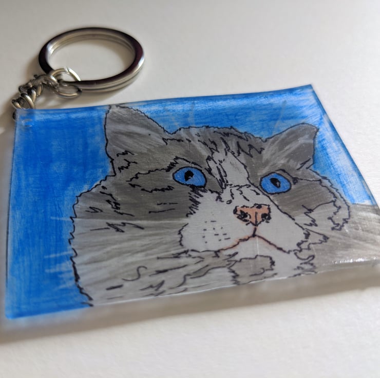 A handmade Ragdoll Cat keyring, hand drawn using ink and Faber Castell polychromos.