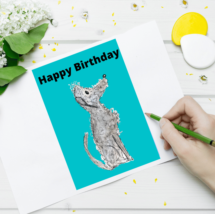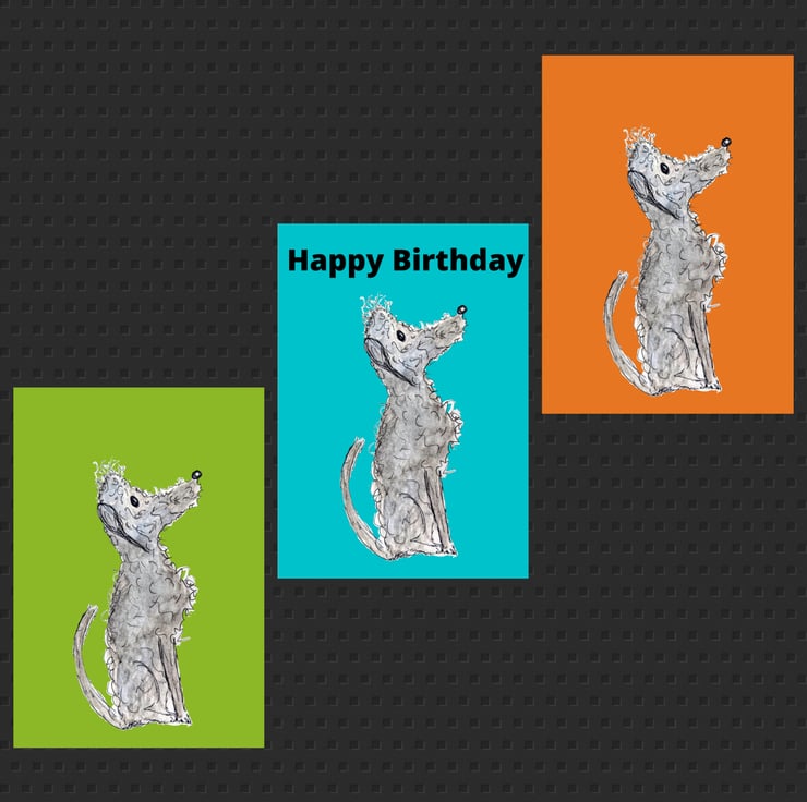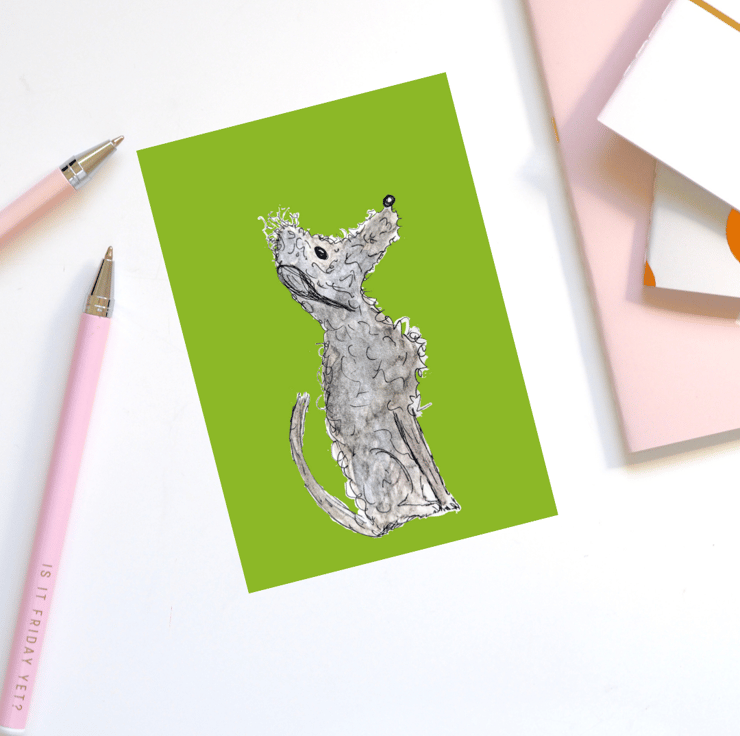 A beautifully printed A6 card, featuring an ink and watercolour illustration of my Bedlington Terrier dog, Summer. It is printed onto a lovely 350gsm linen effect textured card, which has a luxurious matt finish.
