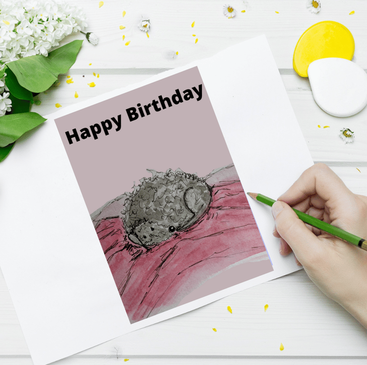 A sleeping Bedlington Terrier Dog , which has been painted using in ink and watercolour and then printed onto an A6 card. It has been printed onto a lovely 300gsm linen effect white card, which has is textured and has a lovely matt finish