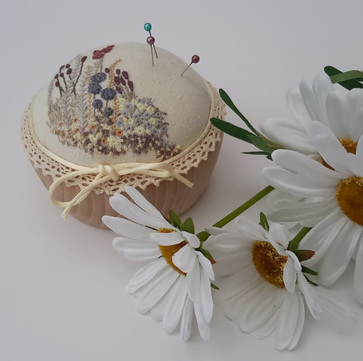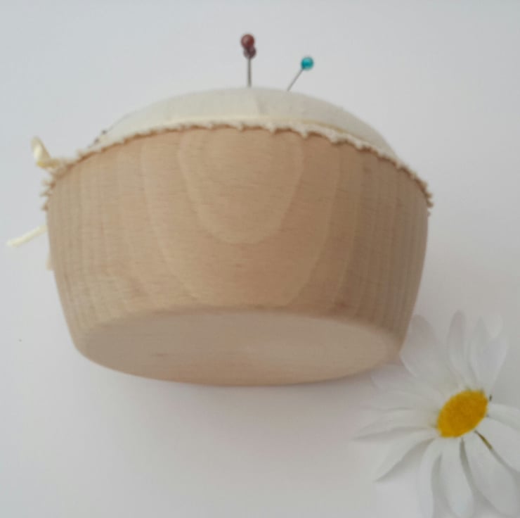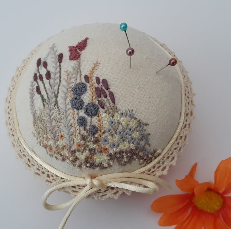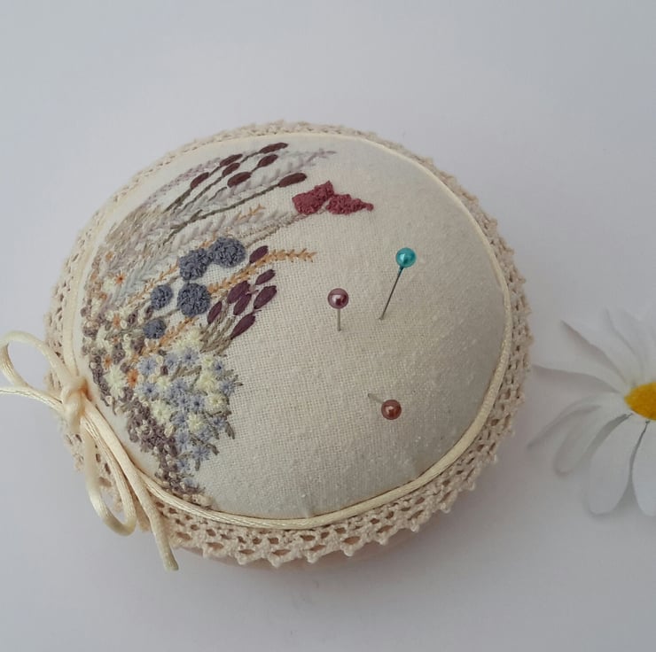 The pincushion has been finished with natural cotton lace and cream satin rolled ribbon to give a feeling of nostalgia and a bygone era.