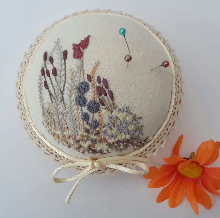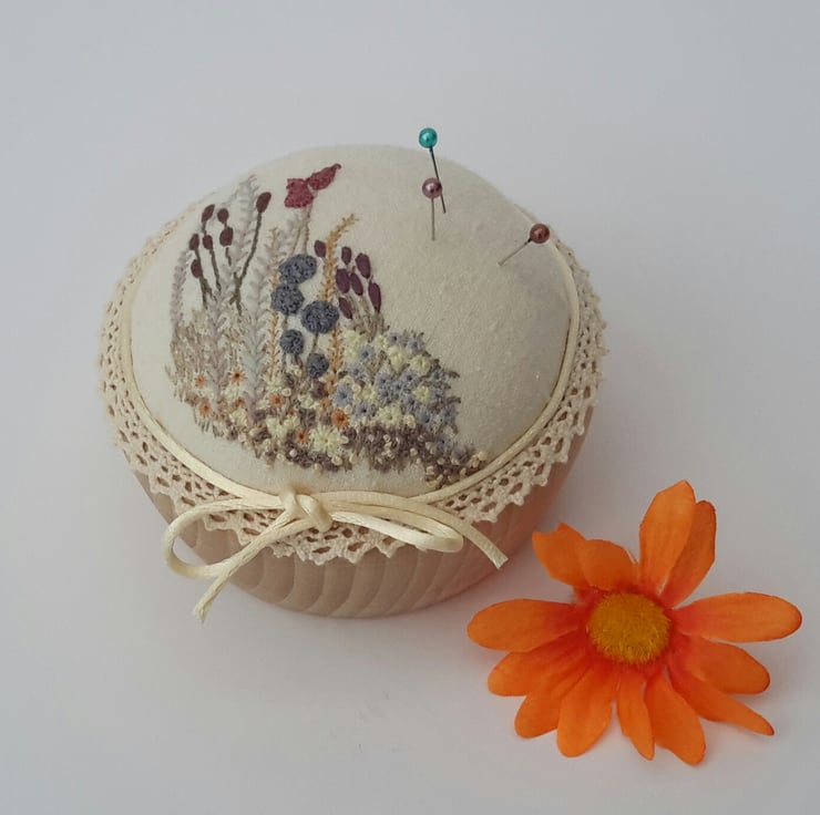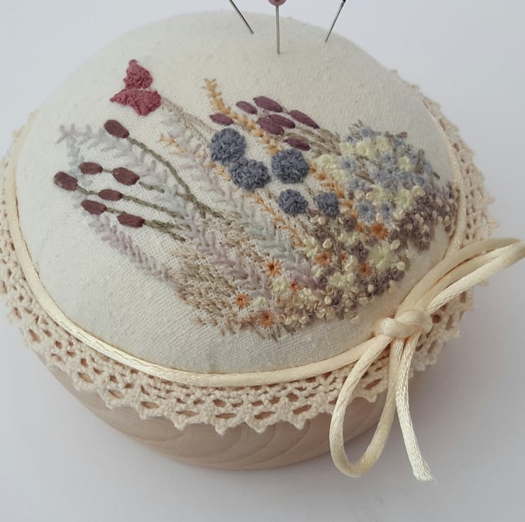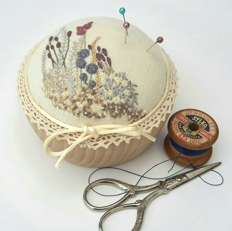 Measuring approx 4" in diameter this beautiful hand embroidered pincushion would make a lovely keepsake gift or a useful addition to a sewing room.