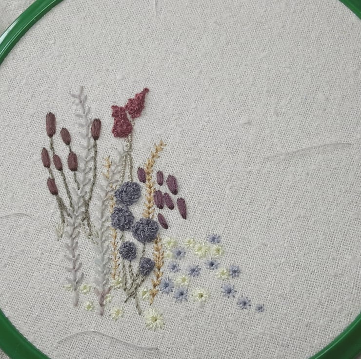 I have hand sewn a delicate floral scene onto natural silk noil fabric using various threads and stitches.