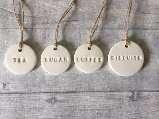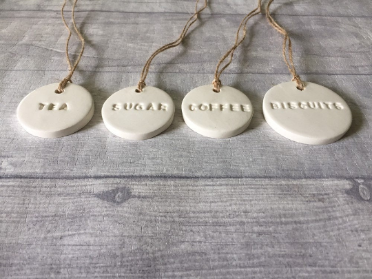 Here we have my handcrafted, ceramic tags. These would make a lovely addition to your kitchen or even as a housewarming gift.