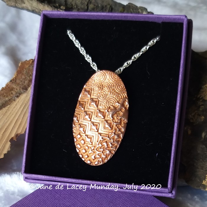 I often use texture mats to apply a particular texture to an item I am making, but usually restricting it to one pattern. I could have done so with this pendant but due to its oval shape, I felt that a varied multiple pattern would look rather lovely. The difference in height of each of the aspects of the patterns and the lower detail all combine to give light a variable surface on which to play and highlight.