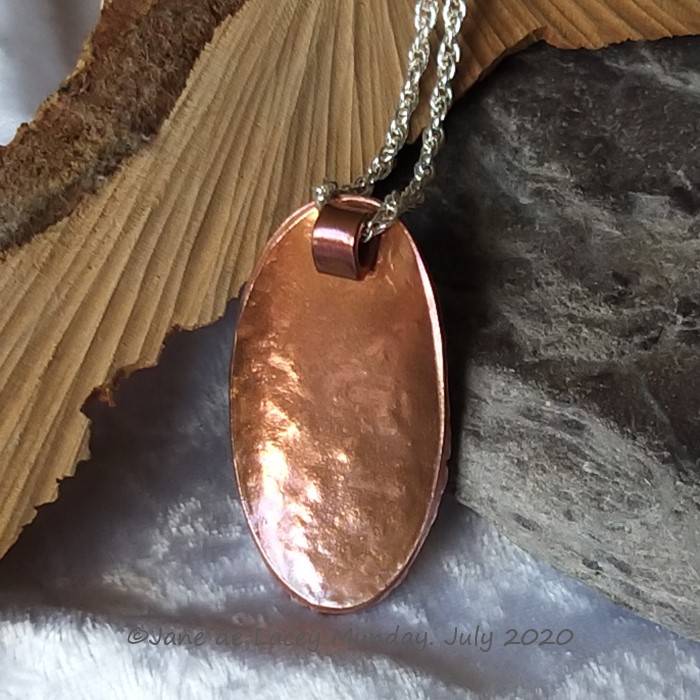 Handcrafted oval pendant with multiple textures, created in copper, hung from a silver plated 18" rope chain. The copper pendant is slightly domed and its underside is smooth.