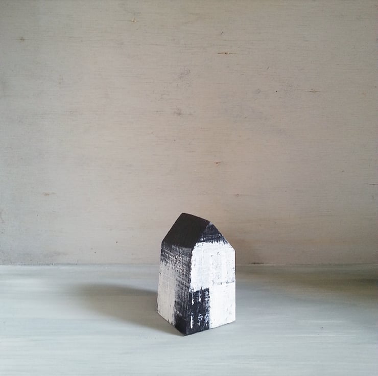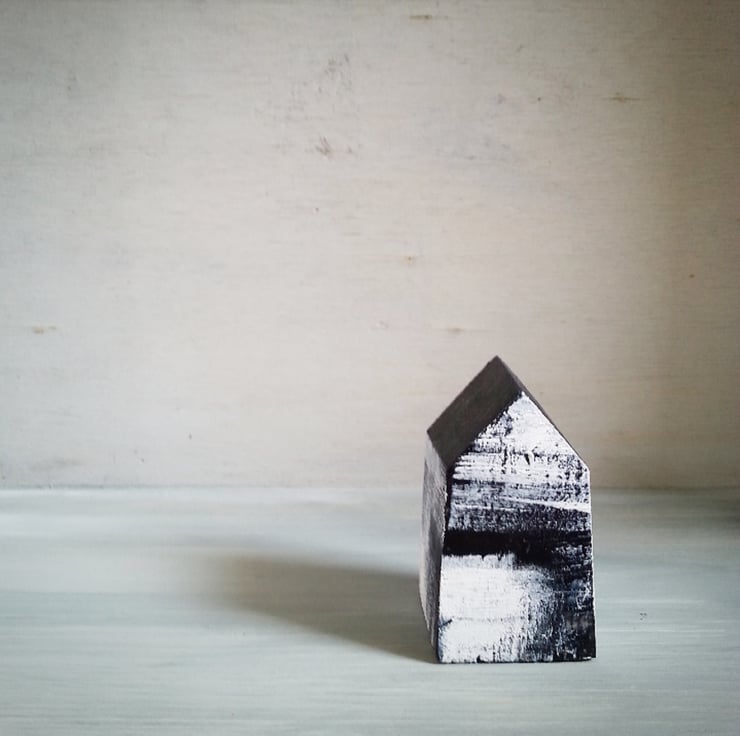 This one of a kind little wooden house is made from reclaimed wood and is painted and screen-printed on all sides in black and white.