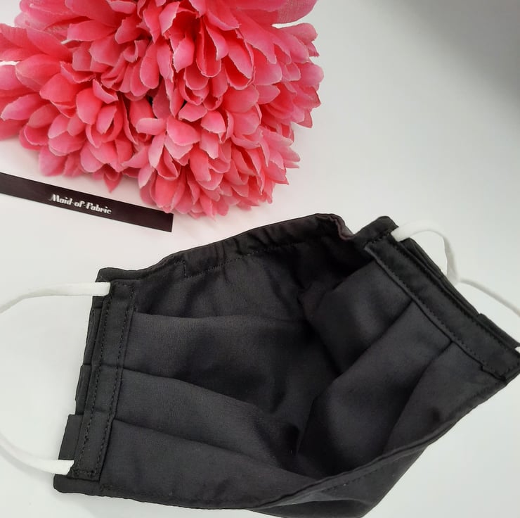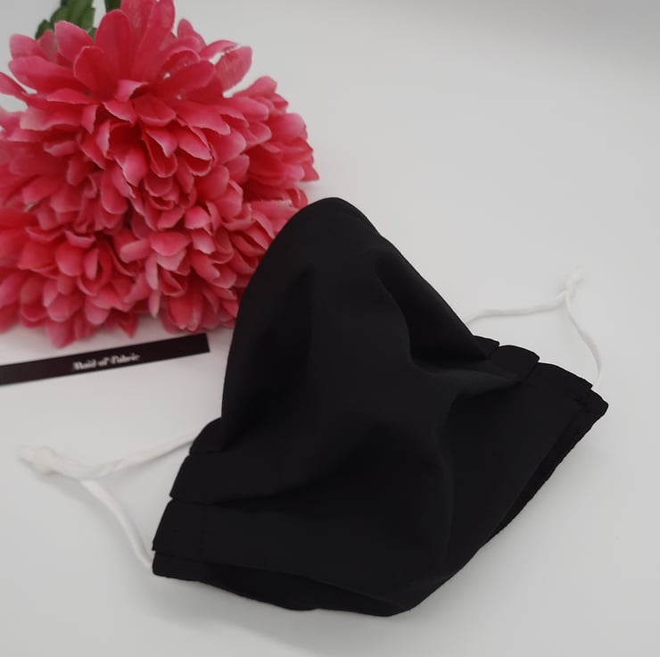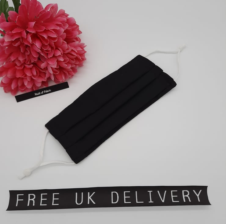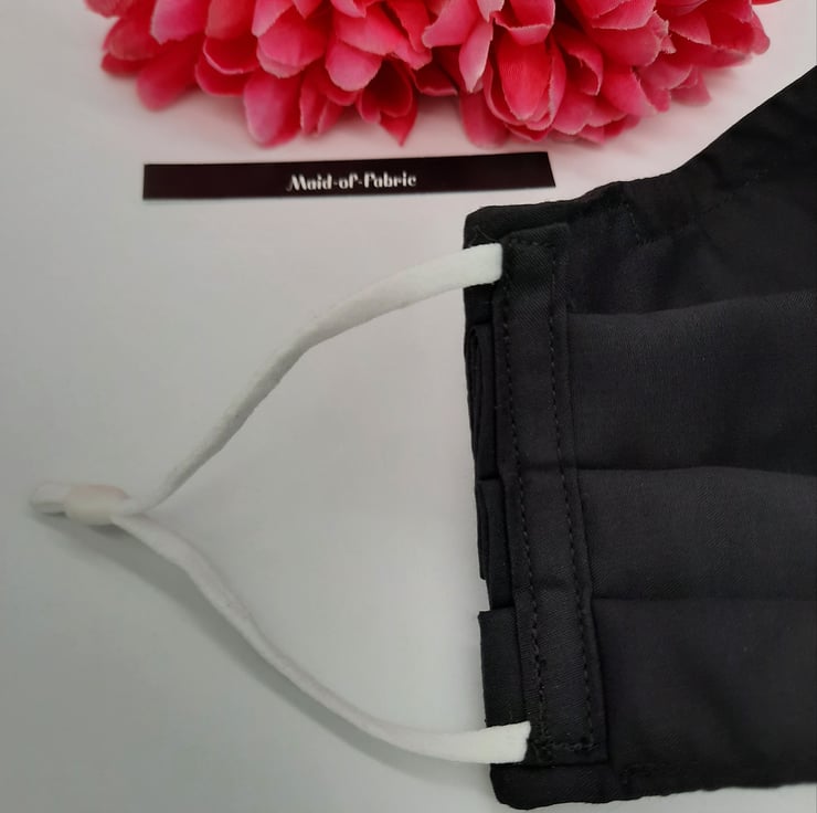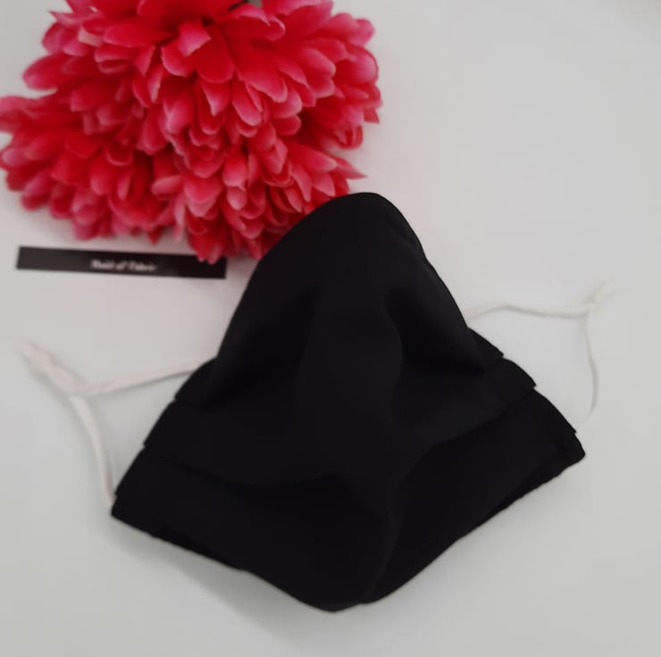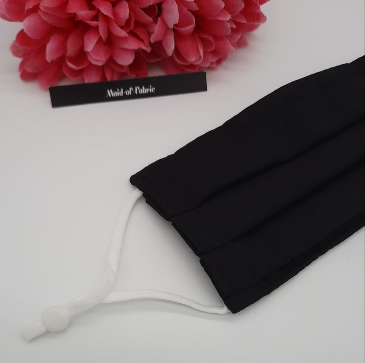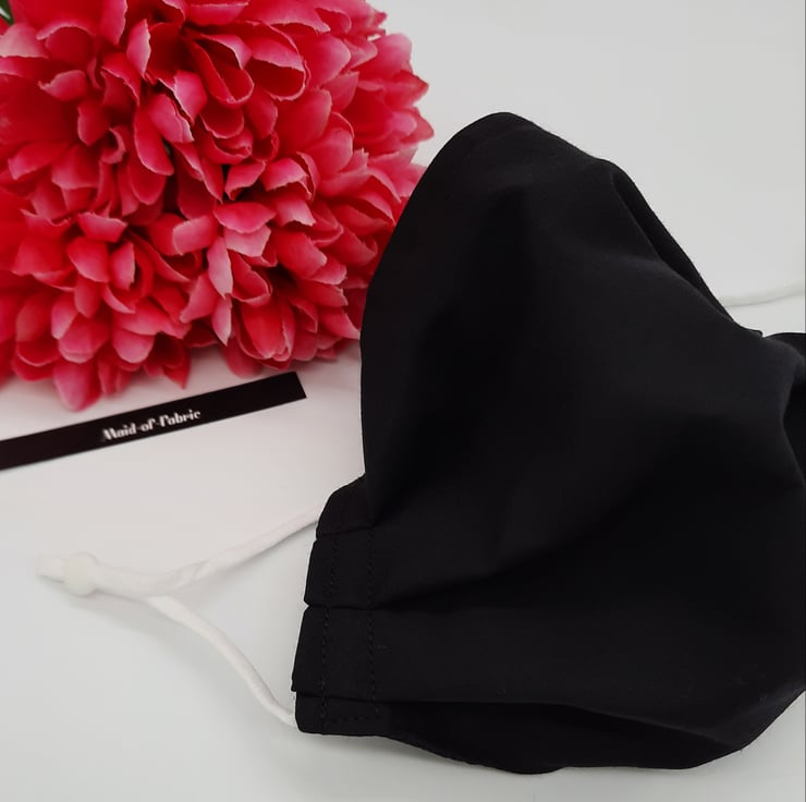 Face mask made using a black cotton fabric, adjustable white elastic and a 9cm flat nose wire.
