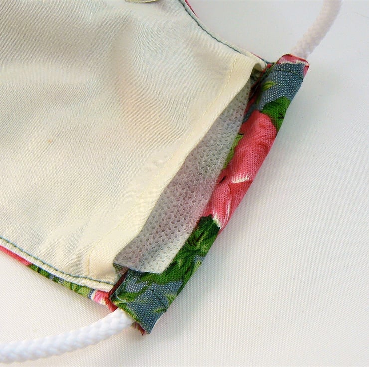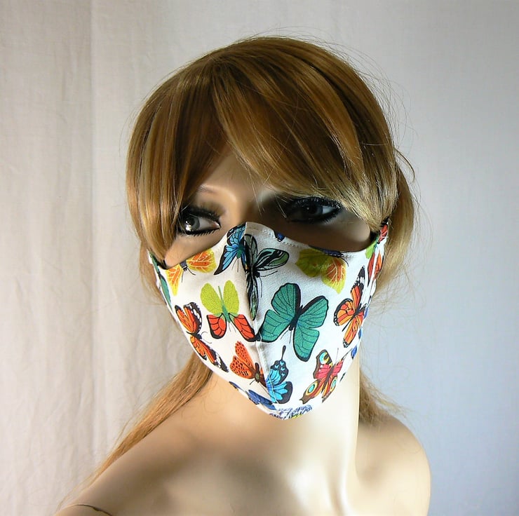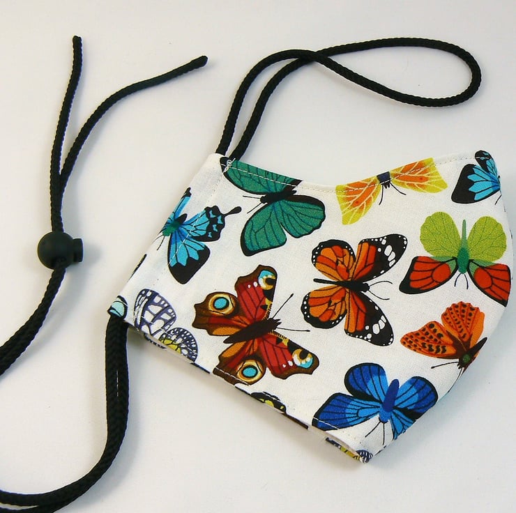 This face mask featuring bright butterflies has removable nose wire, filter pocket with non woven corovin fabric insert and easy fit drawstring toggle for ease of use. Please see photo 3 for corovin insert, 4-5 for how nose wire should look when bent to shape of face and 6-9 for how to put mask on.