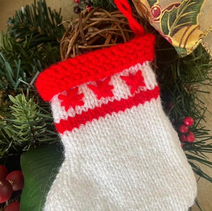 A pair of red and white knitted wool Christmas stocking decorations ready to fill with sweets and hang from the Christmas tree.