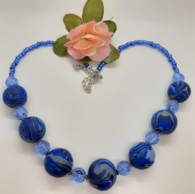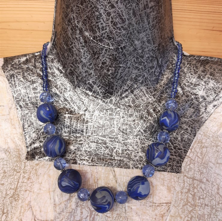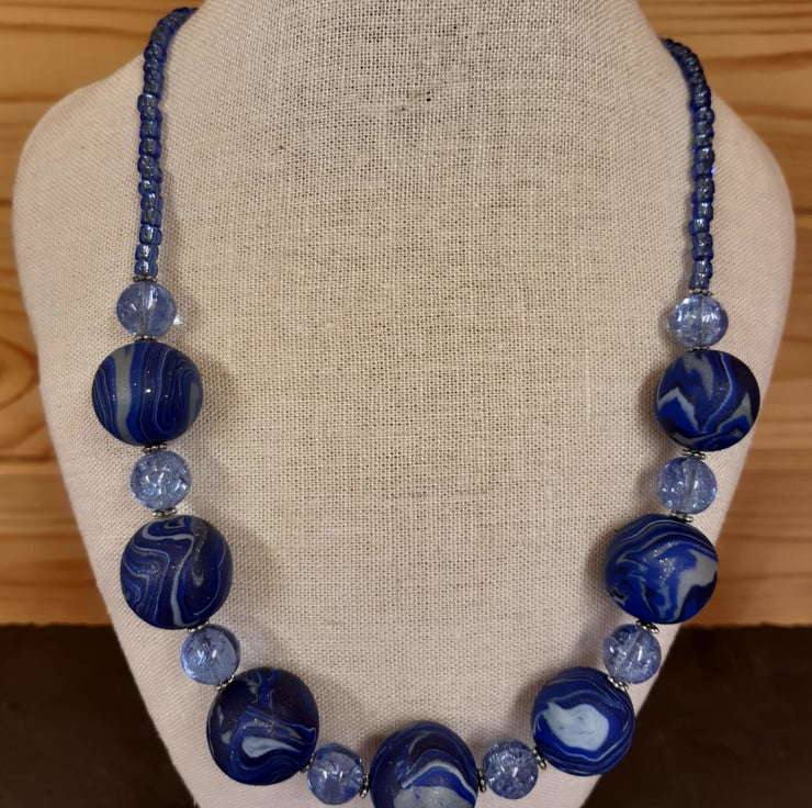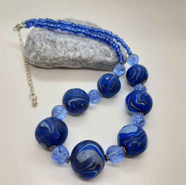 Made with a mixture of royal,navy and light blue polymer clay with a hint of sparkle, the largest bead measure approx 20mm. This exclusive necklace is interspersed with 10mm blue glass beads and silver plated daisy spacers.