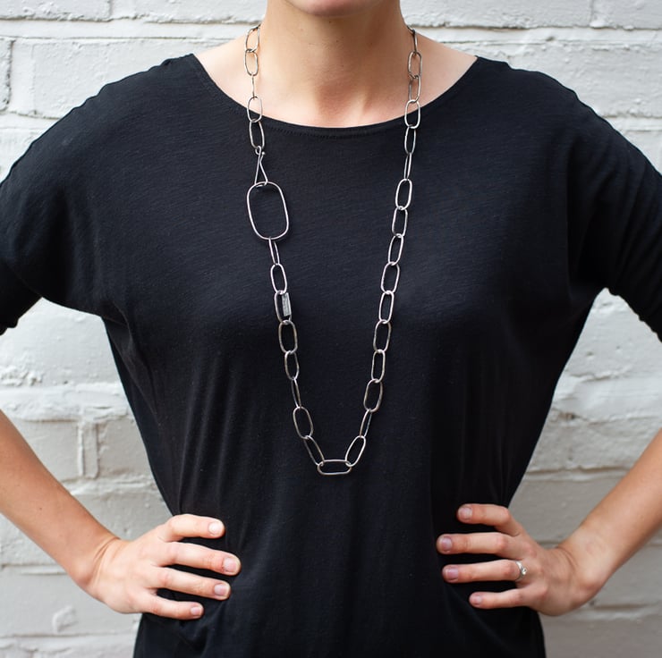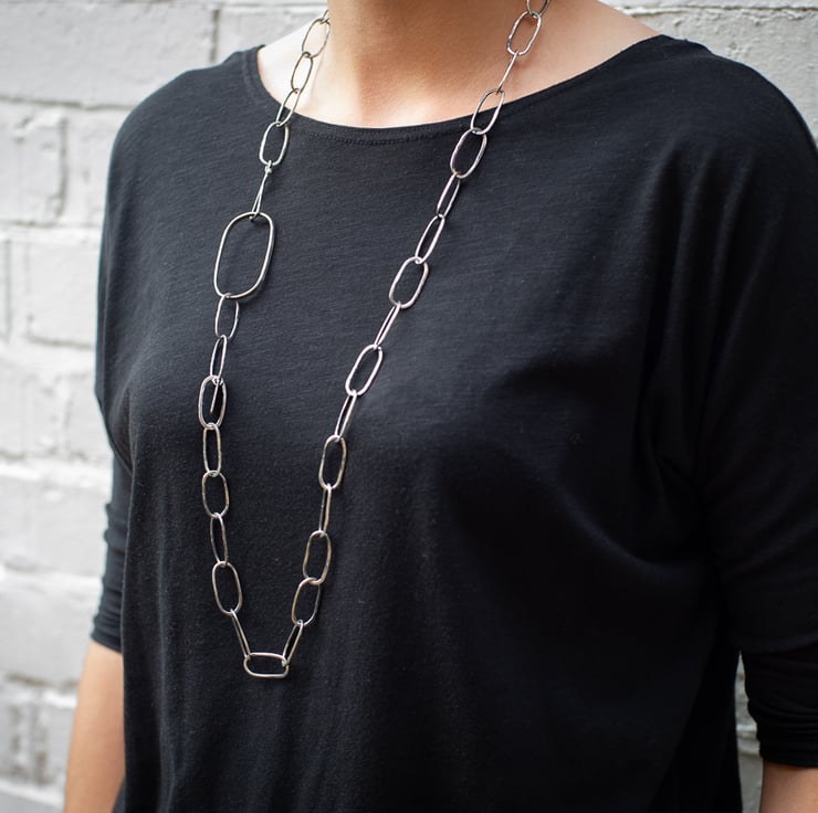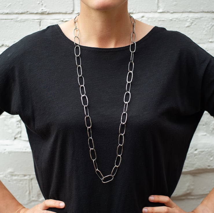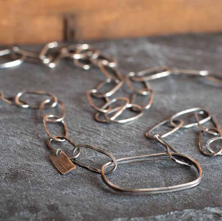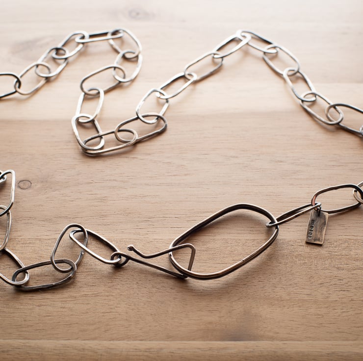 I have used silver wire to hand form each link, which has then been soldered, shaped and hammer textured. The clasp has been handmade as a statement element, and links to a large rectangular loop which can either be worn at the front or at the back of the neck. The necklace also features a small rectangular tag which has been hallmarked.