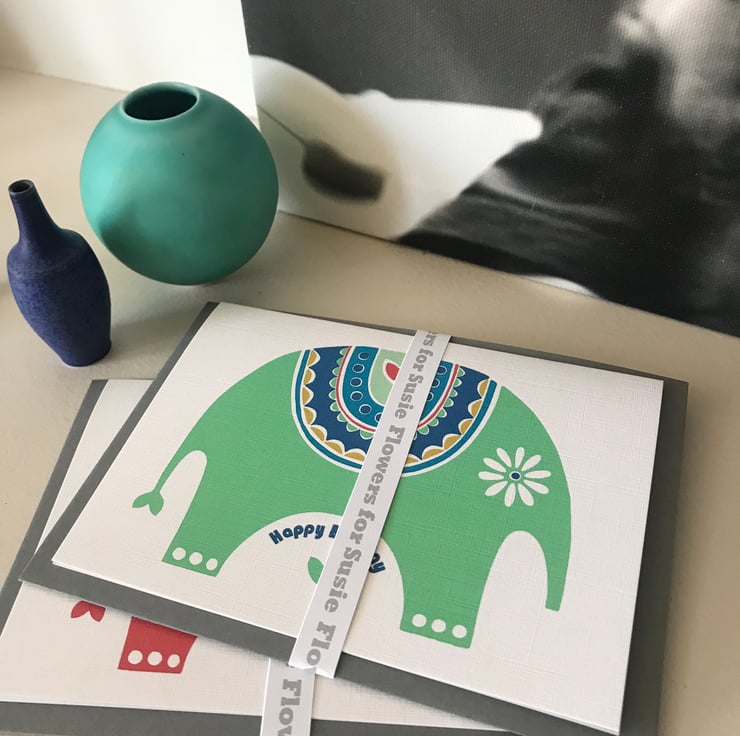 All my designs are Inspired by Scandinavian and mid century pattern and colour. I love the simplistic aesthetic and try to create this in my work. My idea for this 'Little Elephant' design came from the amazingly ornate elephants in Indian celebrations. This alongside the fabulous strong vibrant colours you see within India culture really sparked an idea in my head. This little pair has actually been sat in my sketchbook for a while and thanks to a bespoke request from a loyal customer for an elephant card I finally got him out of the sketchbook.
