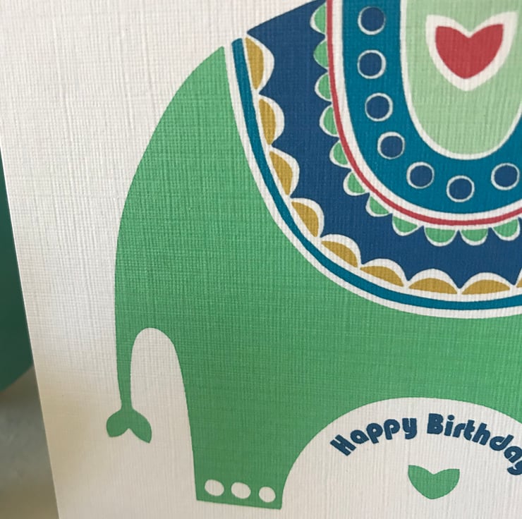This beautiful 'Little Elephant' card in bright mint green with jewel colour accents is a perfect card for any occasion.
