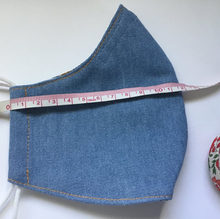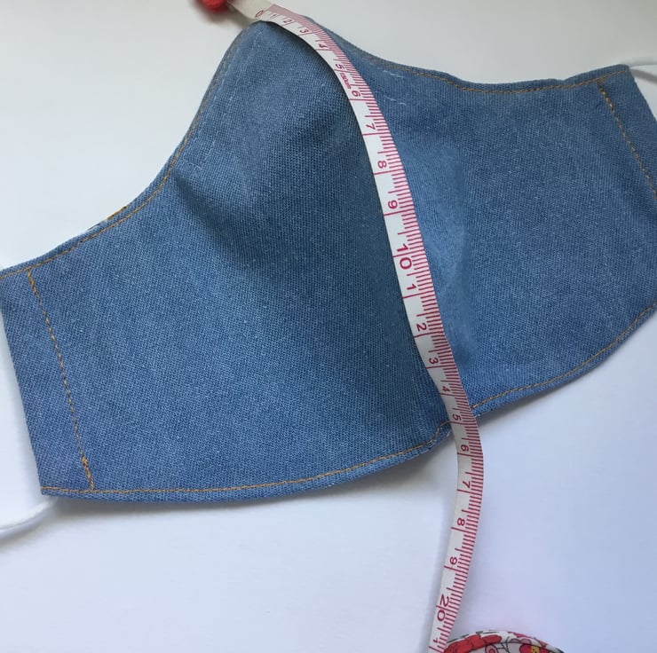 Denim and Liberty Face Covering with a removable nose wire and elastic ear loops with 30cm each side for you to adjust to size.