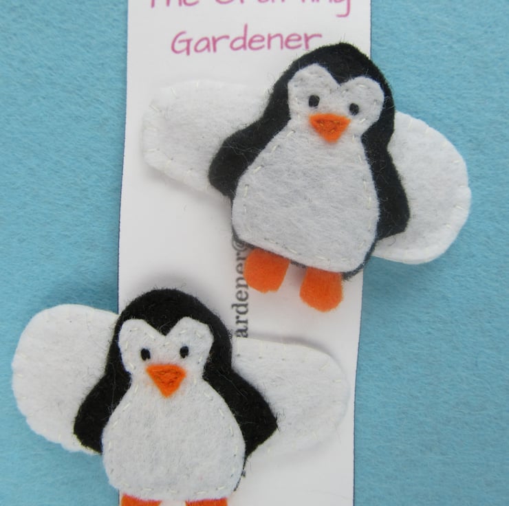 Each penguin hair clip is hand cut and stitched by me from hardened acrylic black and white felt, with orange feet and beak. It is attached to the metal snap hair clip with white felt.
