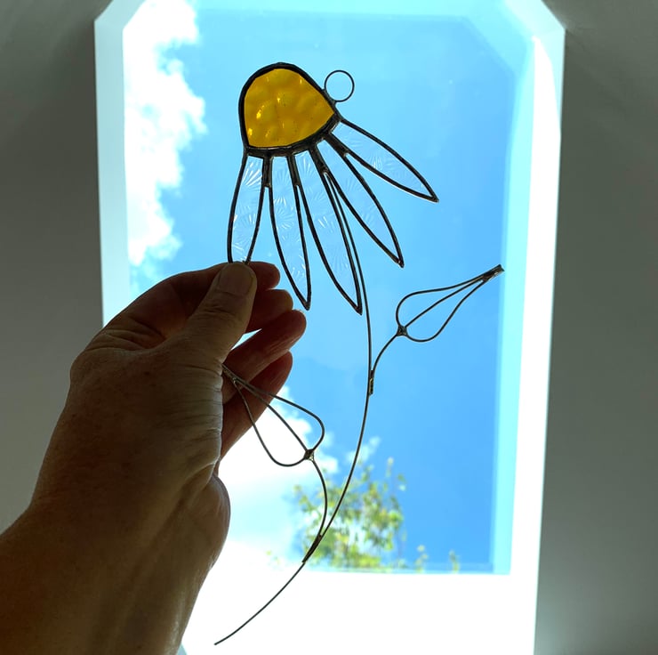 Each piece of glass had been hand cut, ground, foiled and soldered together before being washed and polished. The leaves and stem have been made using tinned wire.