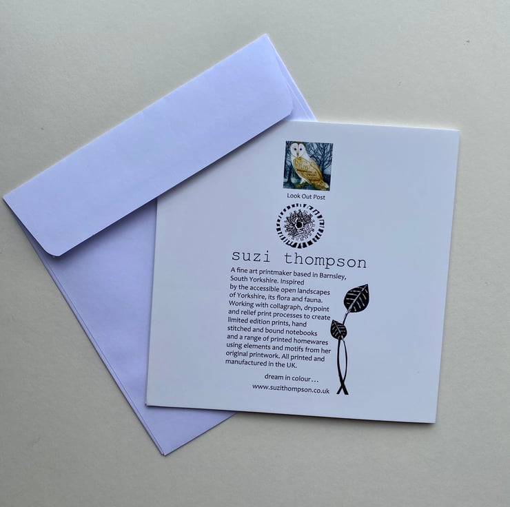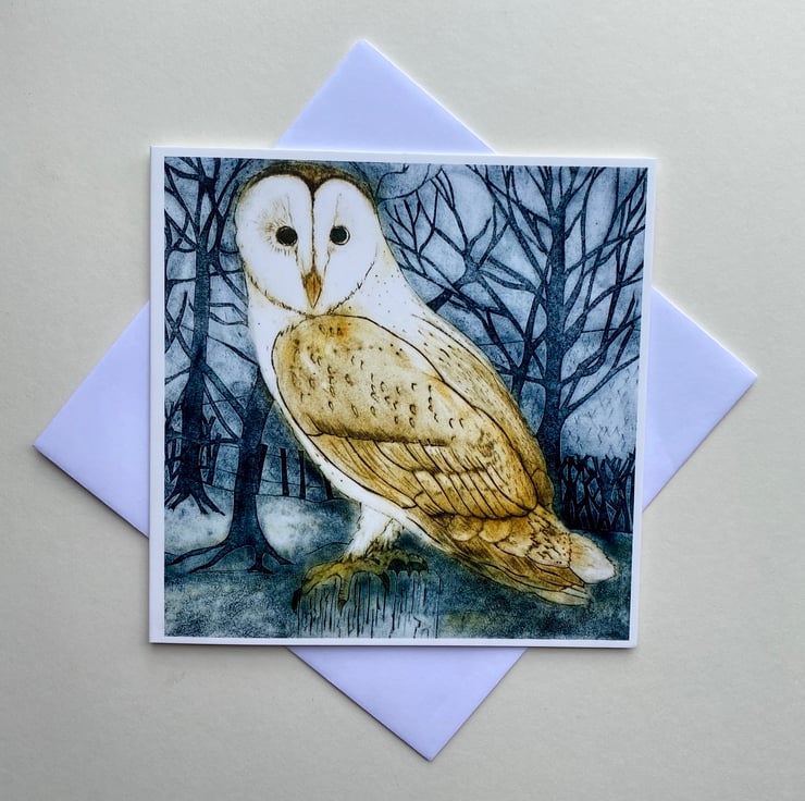 This card is taken from my original and much larger Collagraph print Look Our Post showing a barn owl surveying his territory before taking off on his nightly flight.
