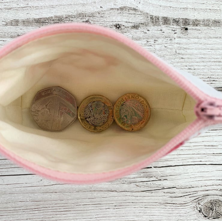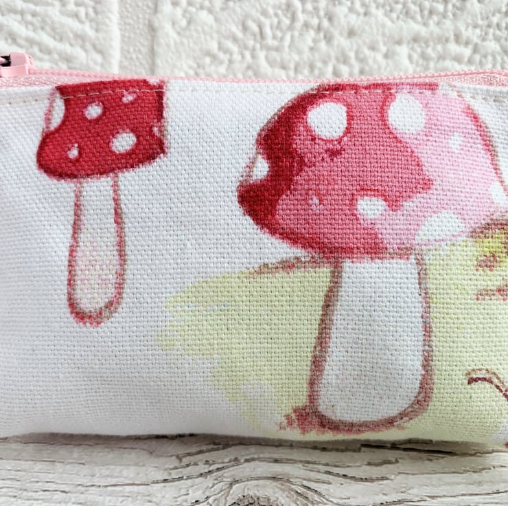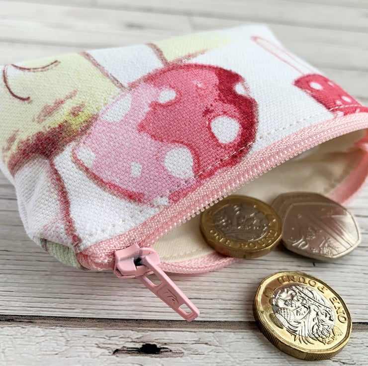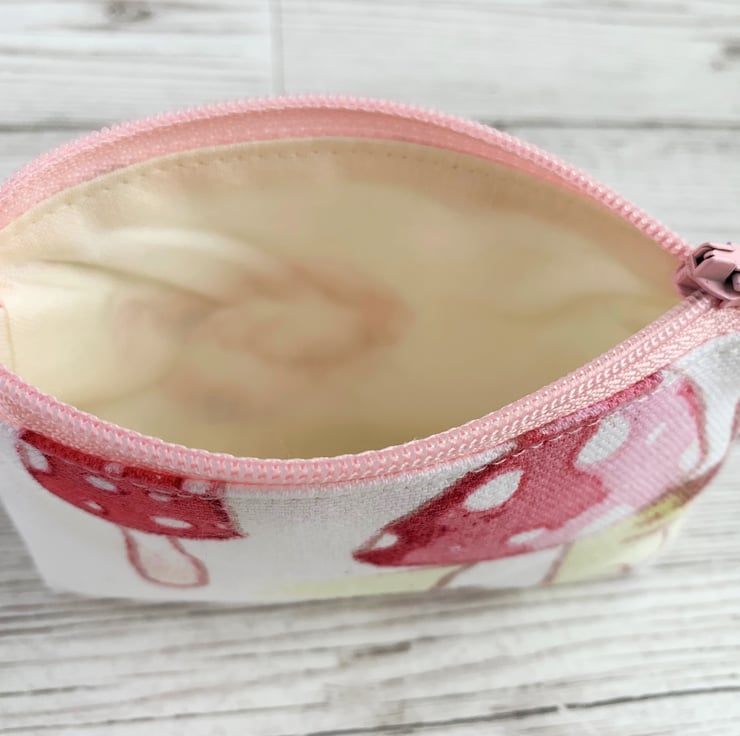A small purse with a delightful toadstools print pattern. The pattern features Fly Agaric mushrooms on a white and yellow background. The toadstools are pink and red with the distinctive white spots of fairy-tale mushrooms. The colours in the pattern are delicate shades of pink, red, yellow and brown. The coin purse has pale pink zip and is lined with cream fabric. The base of the purse is boxed to give more space inside.