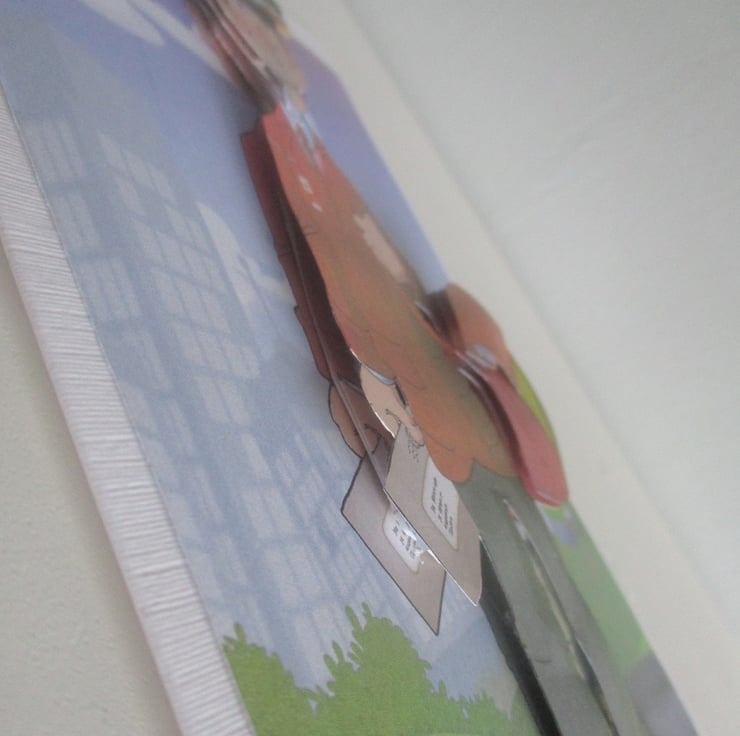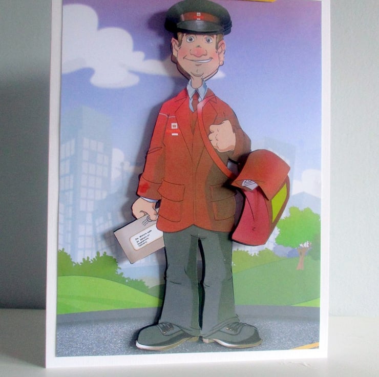 A white card measuring approximately 150x210mm (5.75x8.25in) features a 3D /Decoupage design of a postman