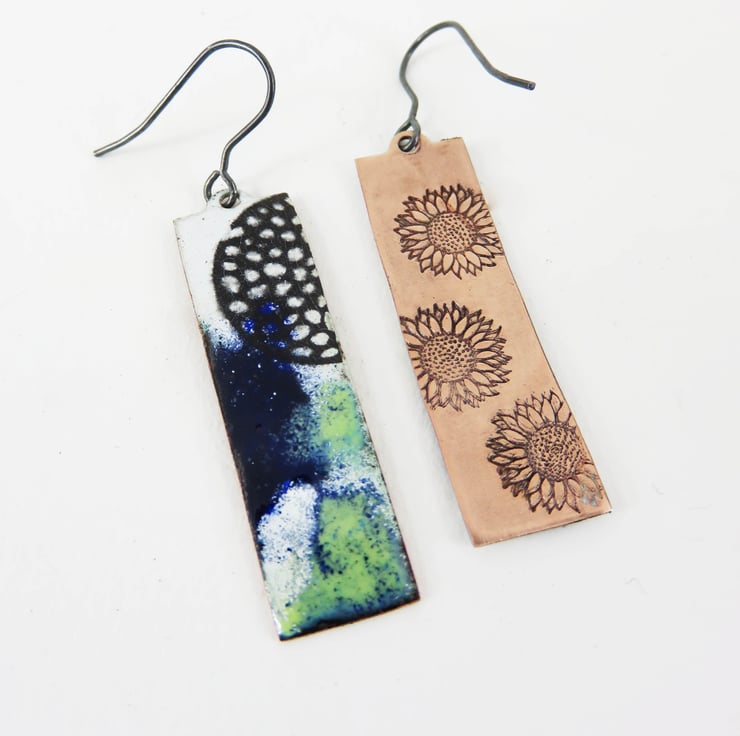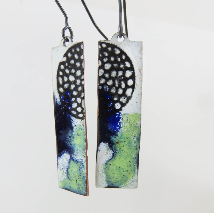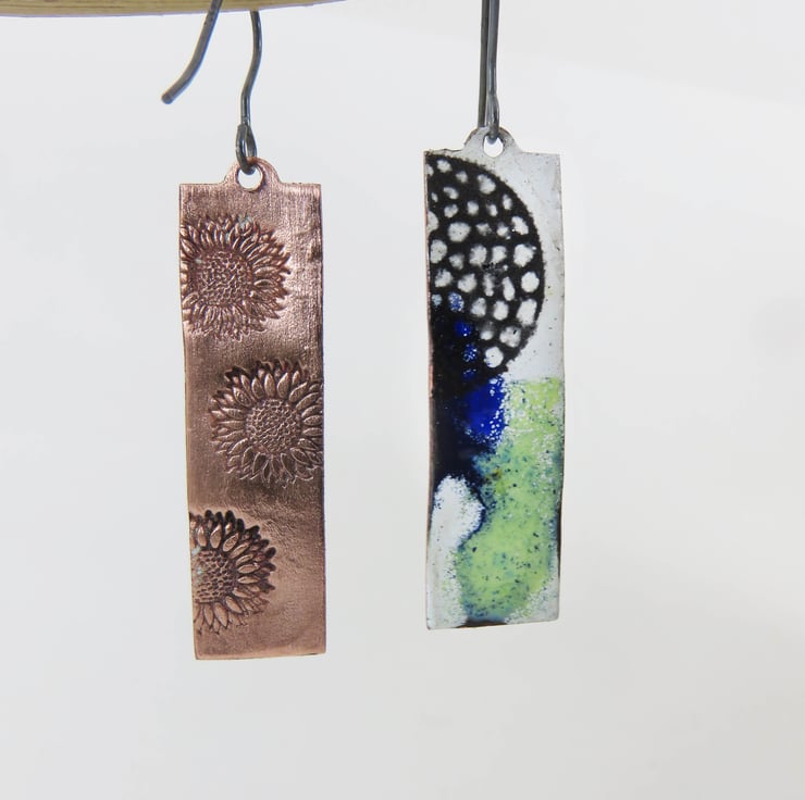 These copper dangle earrings measure 38mm x 10mm. Cut from copper with the backs hammered with one of my flower stamps. White, midnight blue and spring green enamels are placed on the copper and fired in the kiln at 830 degrees several times to create a good blend of colours. I then applied a black pattern to the top and fired again to seal it in place. They hang on oxidised silver wires. Each pair are unique due the hand made process.