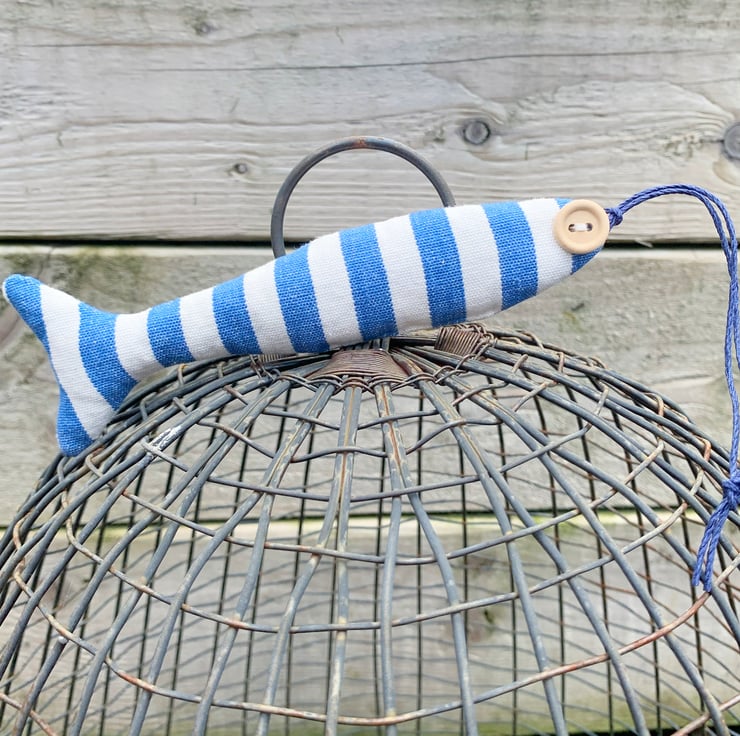 Made of cotton and filled with toy stuffing, this beautiful striped fish comes in coastal blue and white stripes (1cm width stripes on one side and narrower ticking stripes on the other side) with a dark-blue hanging loop and is finished with a wooden button 'eye' on each side plus a linen 'h&h' label.