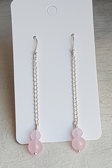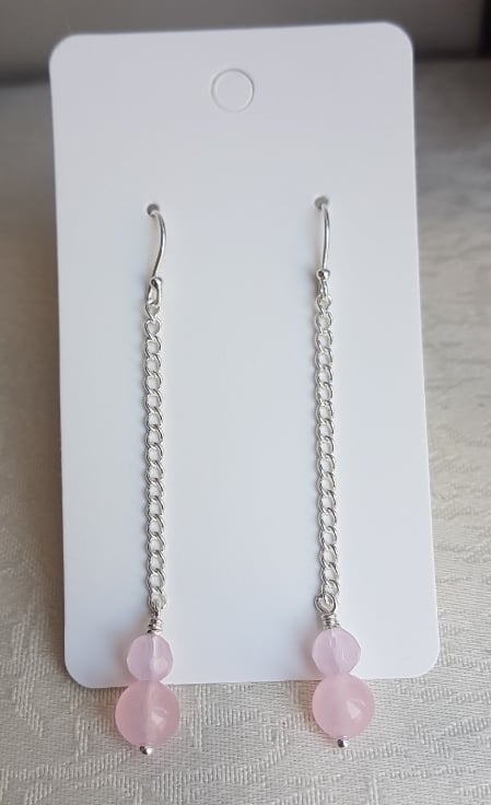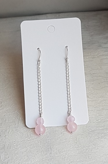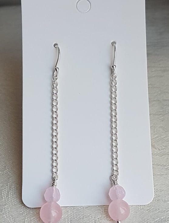 Gorgeous Rose Quartz Dangly Chain Earrings. Beautiful pink tones of Rose Quartz and fabulous silver chain make these lovely earrings simply divine. A pretty pink pair as a gift or as a treat for yourself. Great for those who love pink, silver or dangly jewellery.