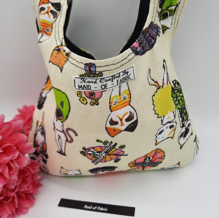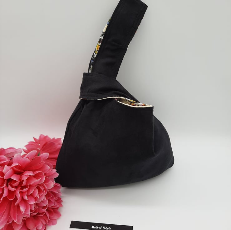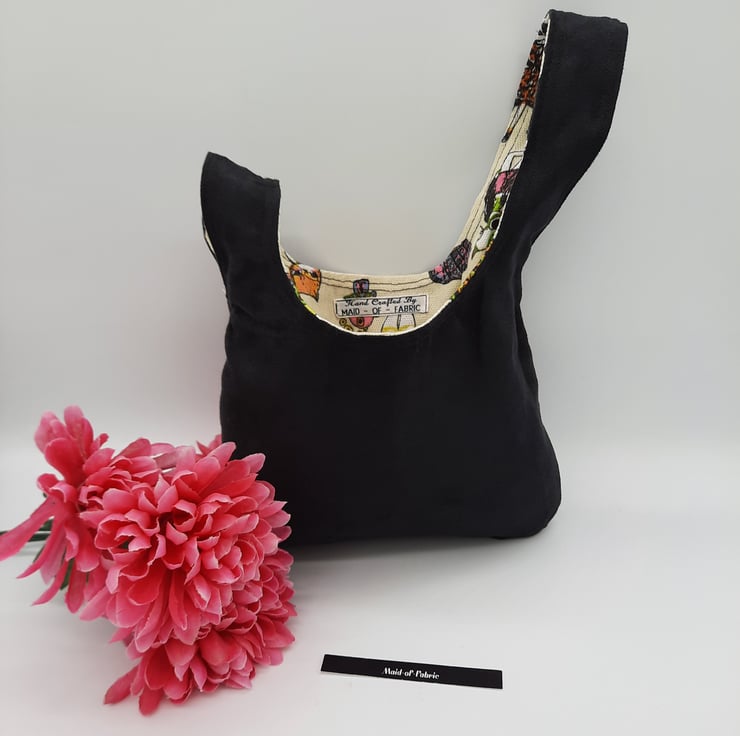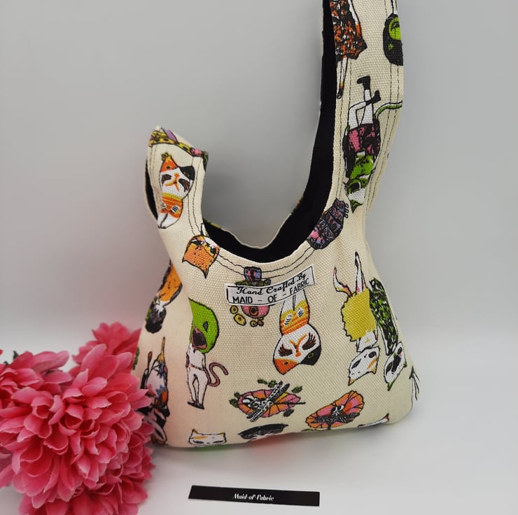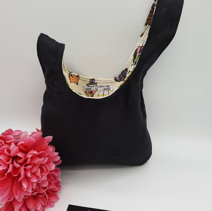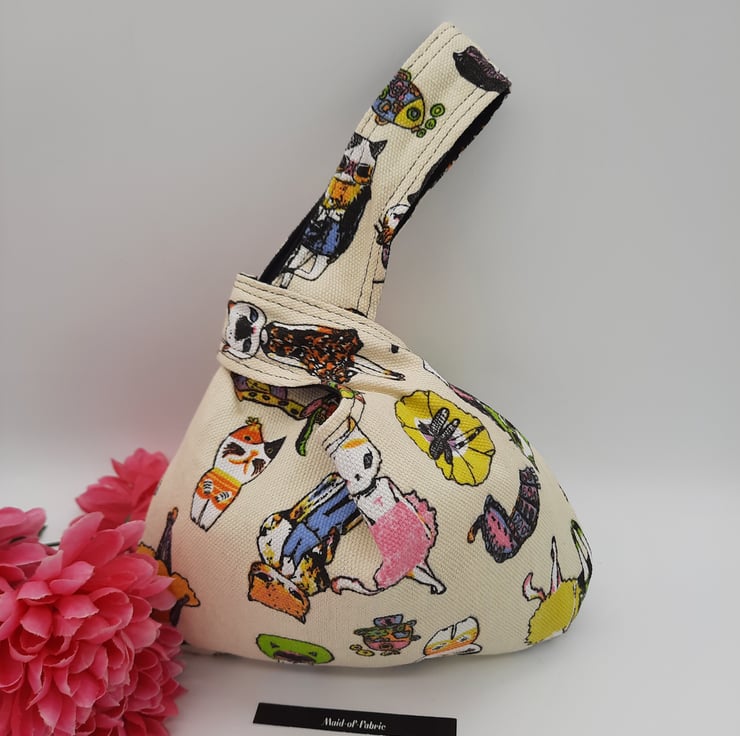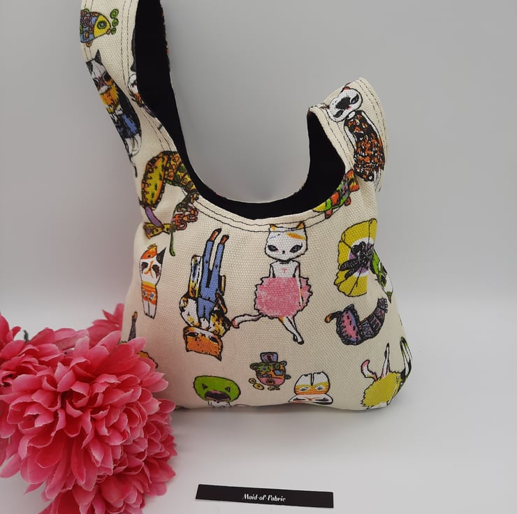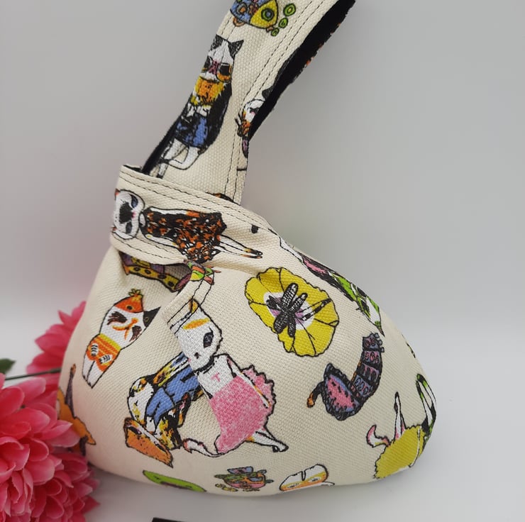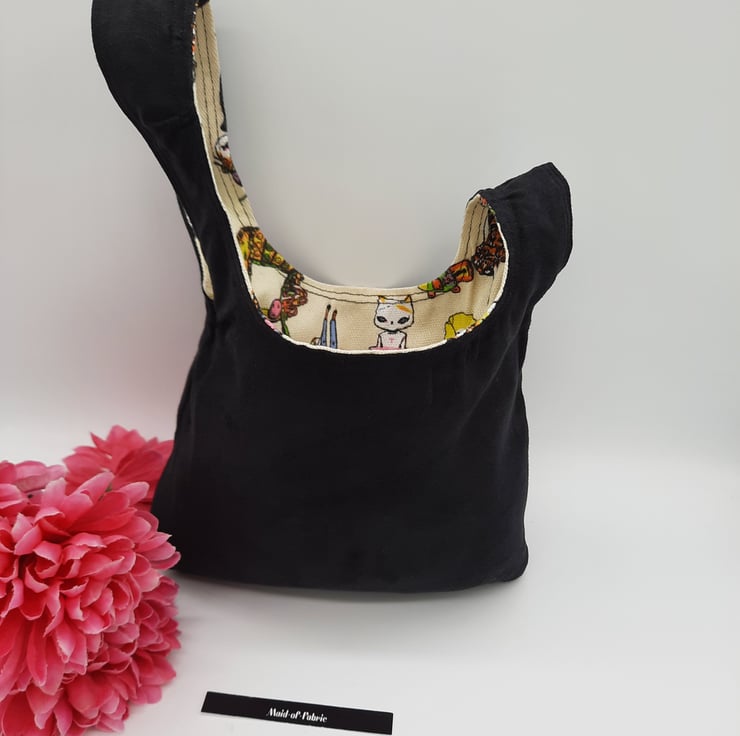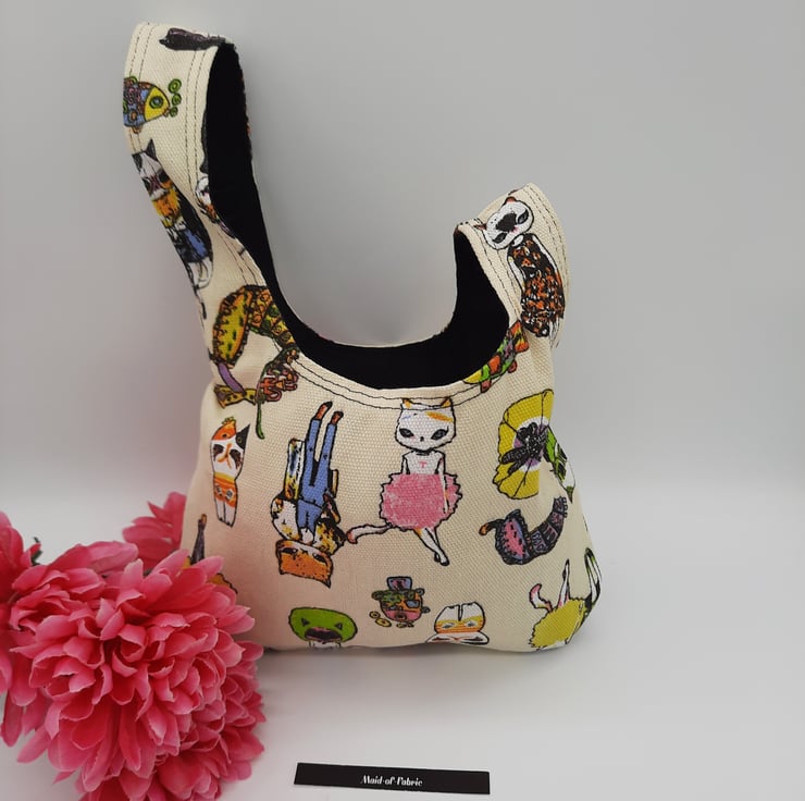Japanese knot bag made using a soft black mole skin effect fabric and a brightly coloured crazy cat themed fabric.