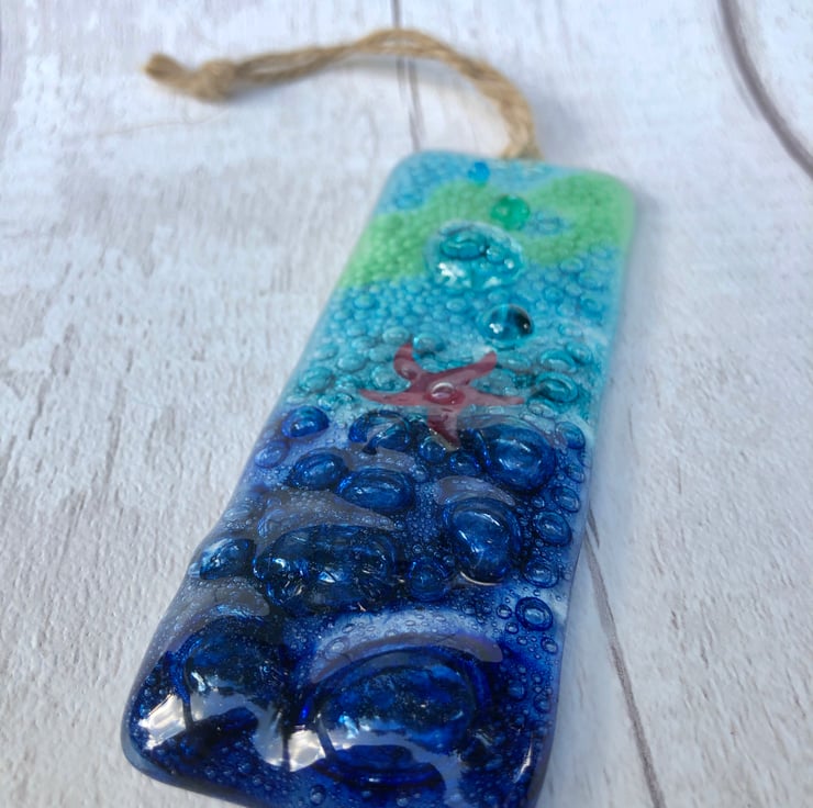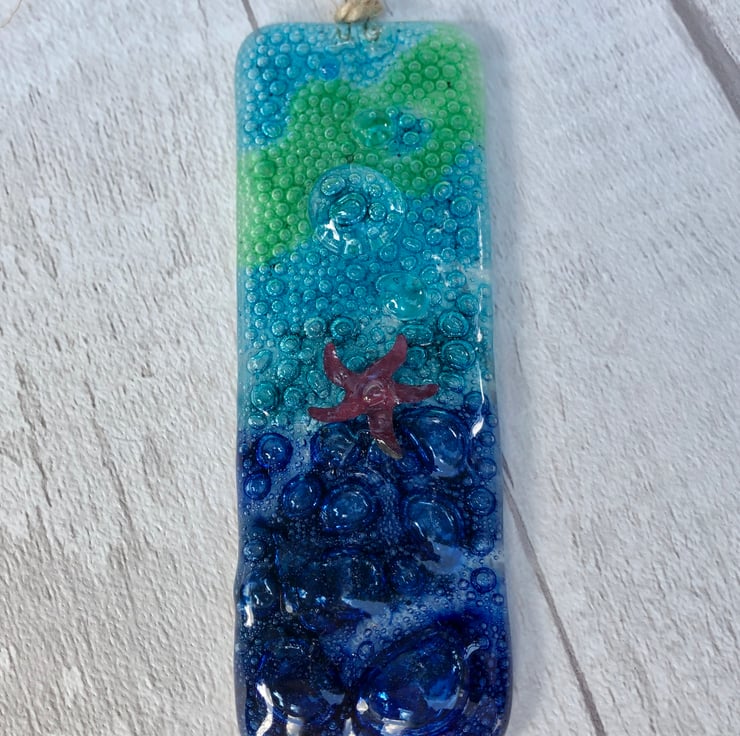 Lovely fused glass sun catcher made with glass enamels that bubble in the kiln that creates the effect of the sea. 12x5cm