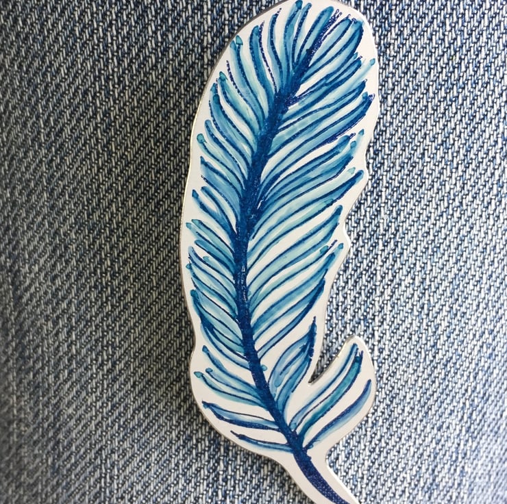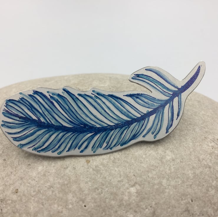 This statement brooch is made of anodised aluminium. It has been printed and hand painted with a beautiful feather design in shades of blue. The brooch measures approx 7cm in length.