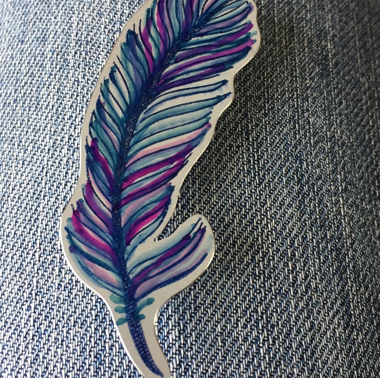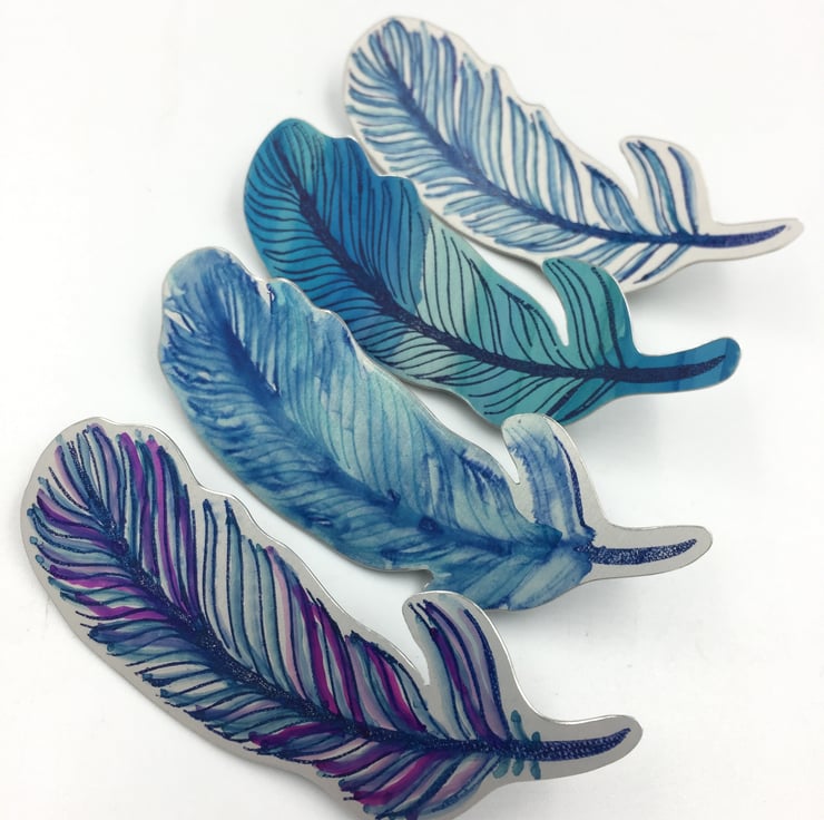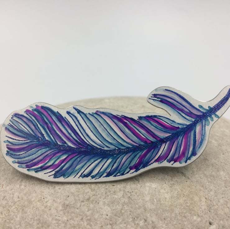 This statement brooch is made of anodised aluminium. It has been printed and hand painted with a beautiful feather design in shades of blue. The brooch measures approx 7cm in length.