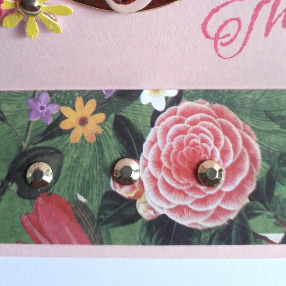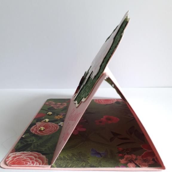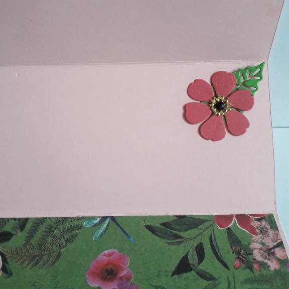 Inside the card is a floral patterned paper, I have raised a strip at the front to act as a stopper, there are 3 gold gems on the stopper.
