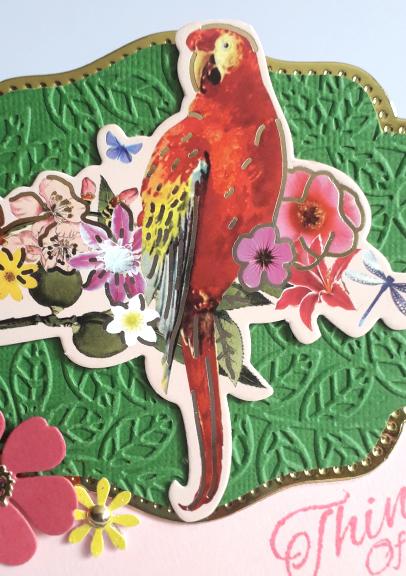 I have placed an image of a colourful parrot sitting on a floral branch onto a green card mat which is embossed with a leaf pattern, then gold card, I have added this topper to a light pink easel style base card.