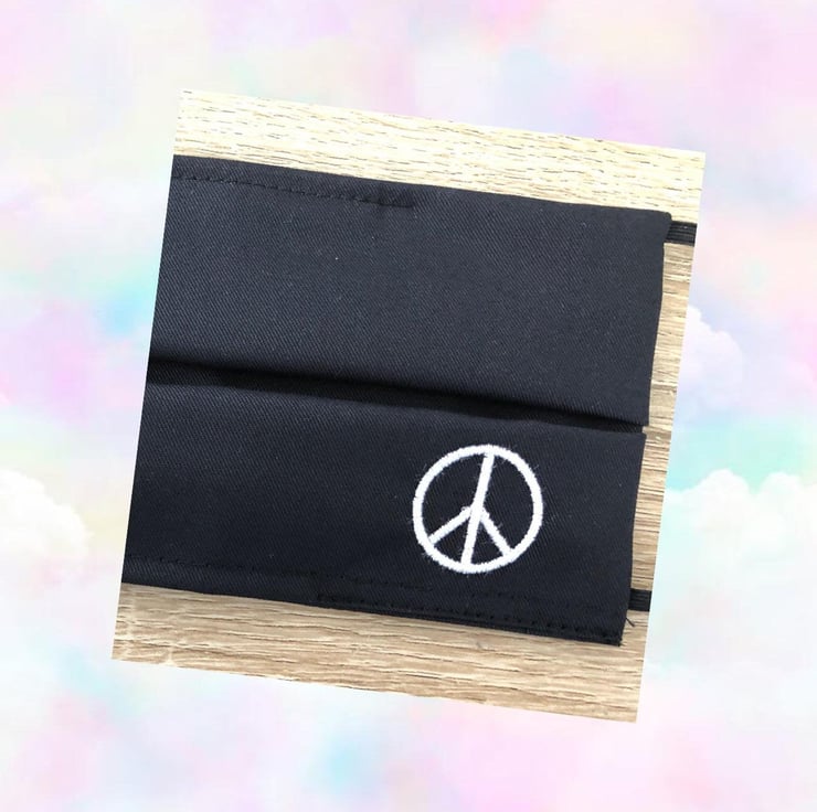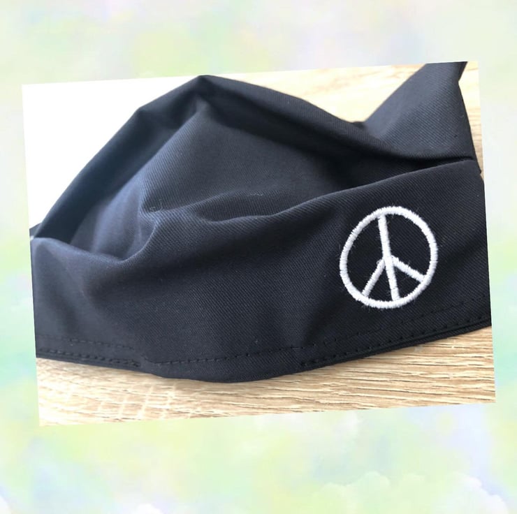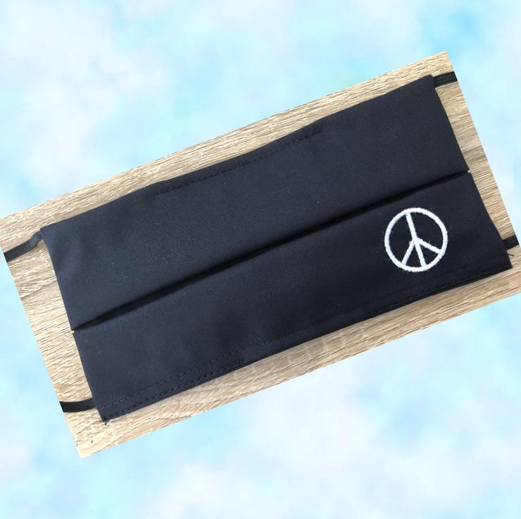 Black coloured Handmade Face mask with the Peace embroidered logo, which stands at 27mm tall.