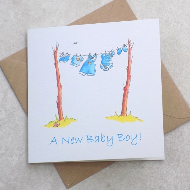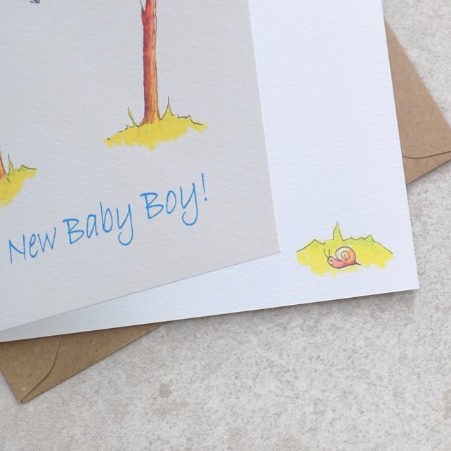 This ecofriendly new baby boy greeting card has been printed on to 100% recycled felt white finish 270g card with own original illustration. It has been left blank inside for your own special message.