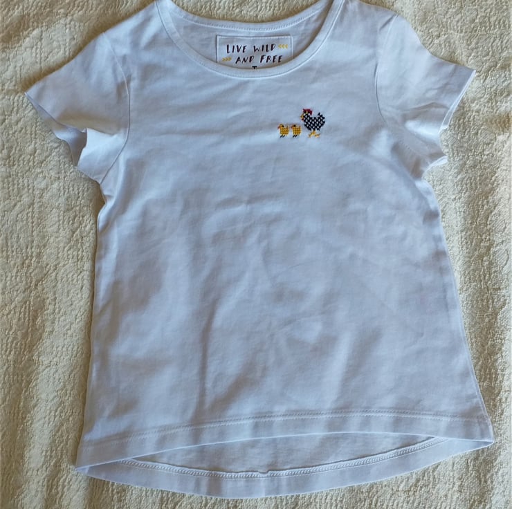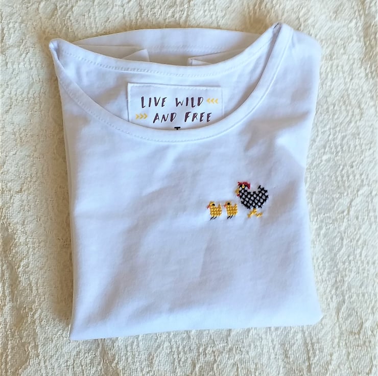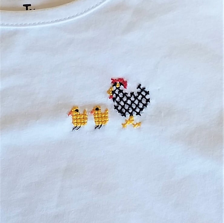 This is a pretty white T-shirt, curved and slightly longer at the back than at the front. I have hand-stitched a black and white hen with her two golden yellow chicks on the left breast.